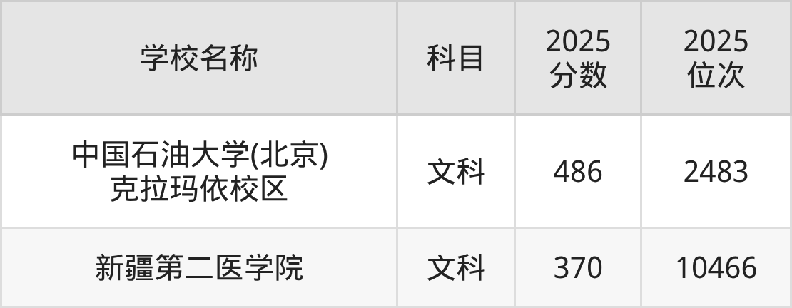 下文为2025年克拉玛依市本科大学在新疆文科录取分数线和位次排名表,供大家参考: