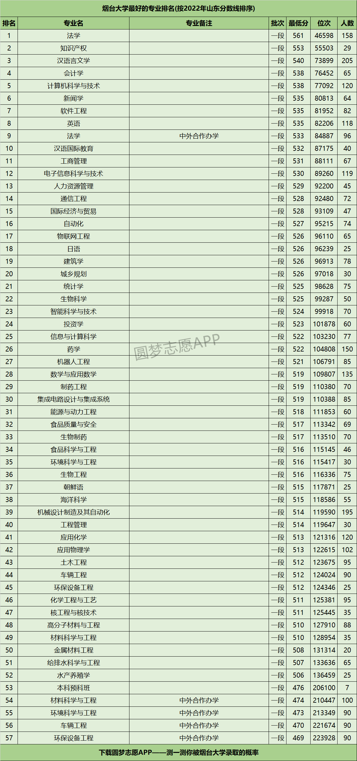 友情提醒:下载圆梦志愿APP,可查阅烟台大学在你的高考省份各专业的录取分数线、位次排名。(各大手机应用市场均可下载圆梦志愿APP)