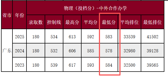 深圳大学的中外合办专业分数线同样较高,学校开设的中外合办专业最低分数线均在583分以上: