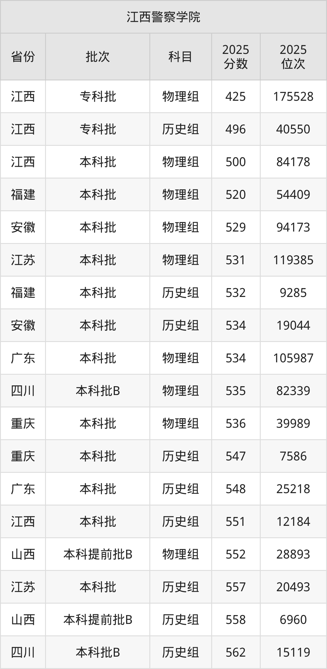 圆梦小编为2026届想要报考江西警察学院的同学整理了:江西警察学院2025年在全国8个省的最低分及录取位次。