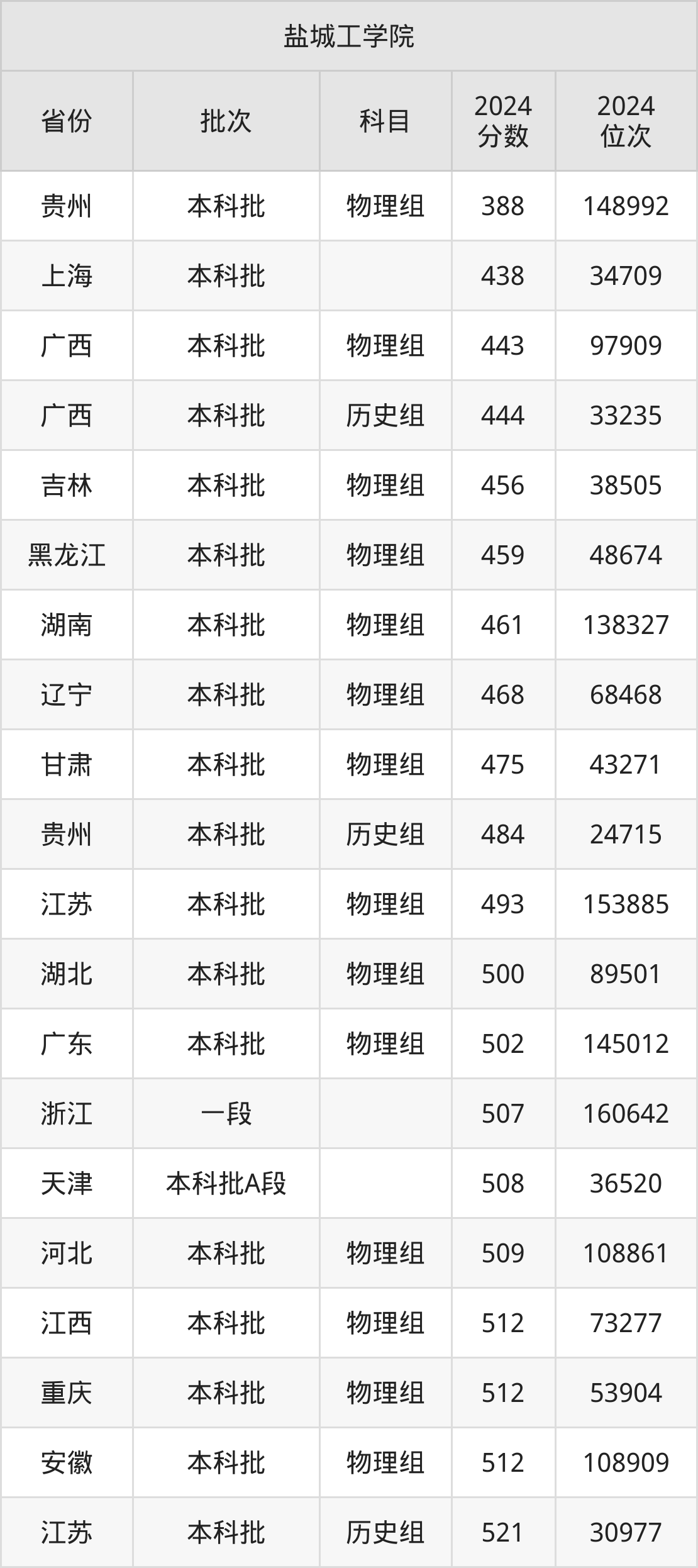 在贵州本科批物理组,盐城工学院的最低分是388、最低录取位次是148992名。在上海本科批,盐城工学院的最低分是438、最低录取位次是34709名。