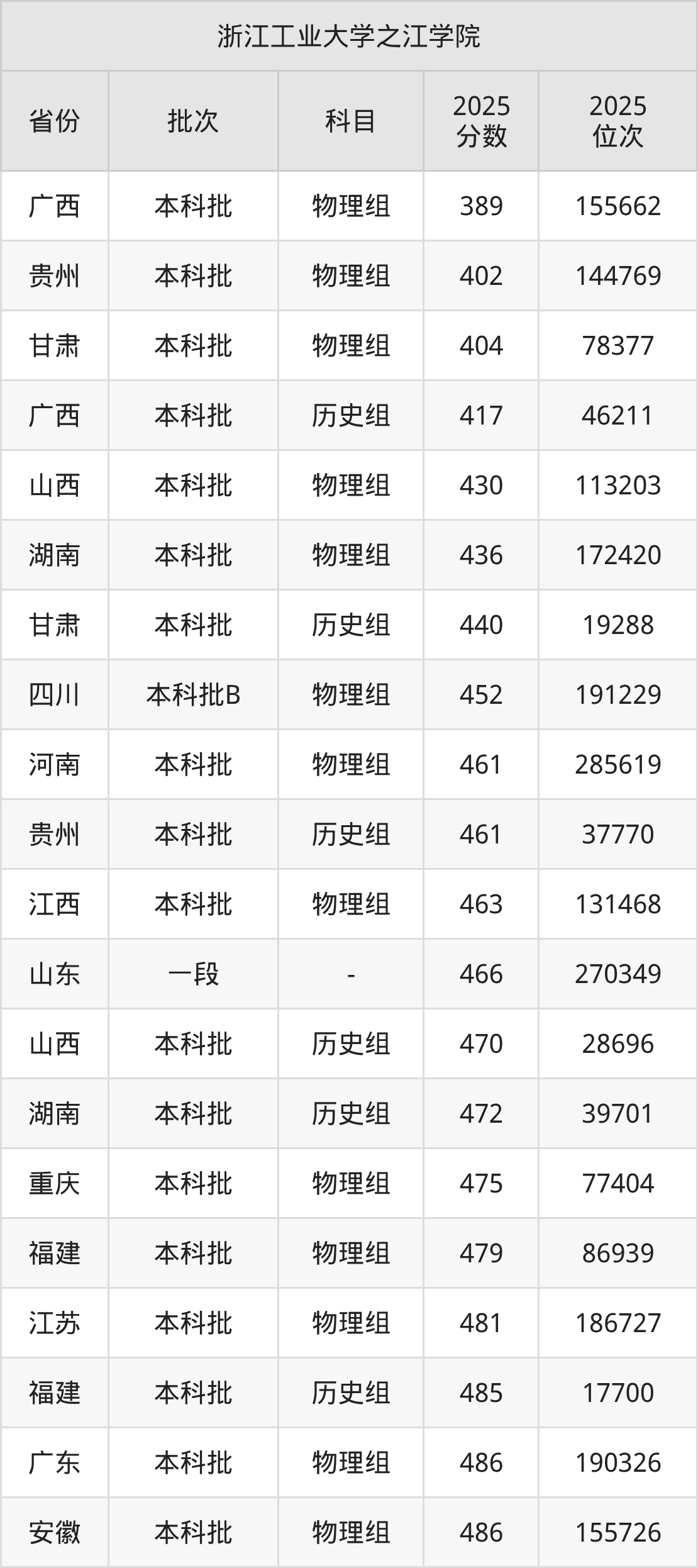 在广西本科批物理组,浙江工业大学之江学院的最低分是389、最低录取位次是155662名。在贵州本科批物理组,浙江工业大学之江学院的最低分是402、最低录取位次是144769名。