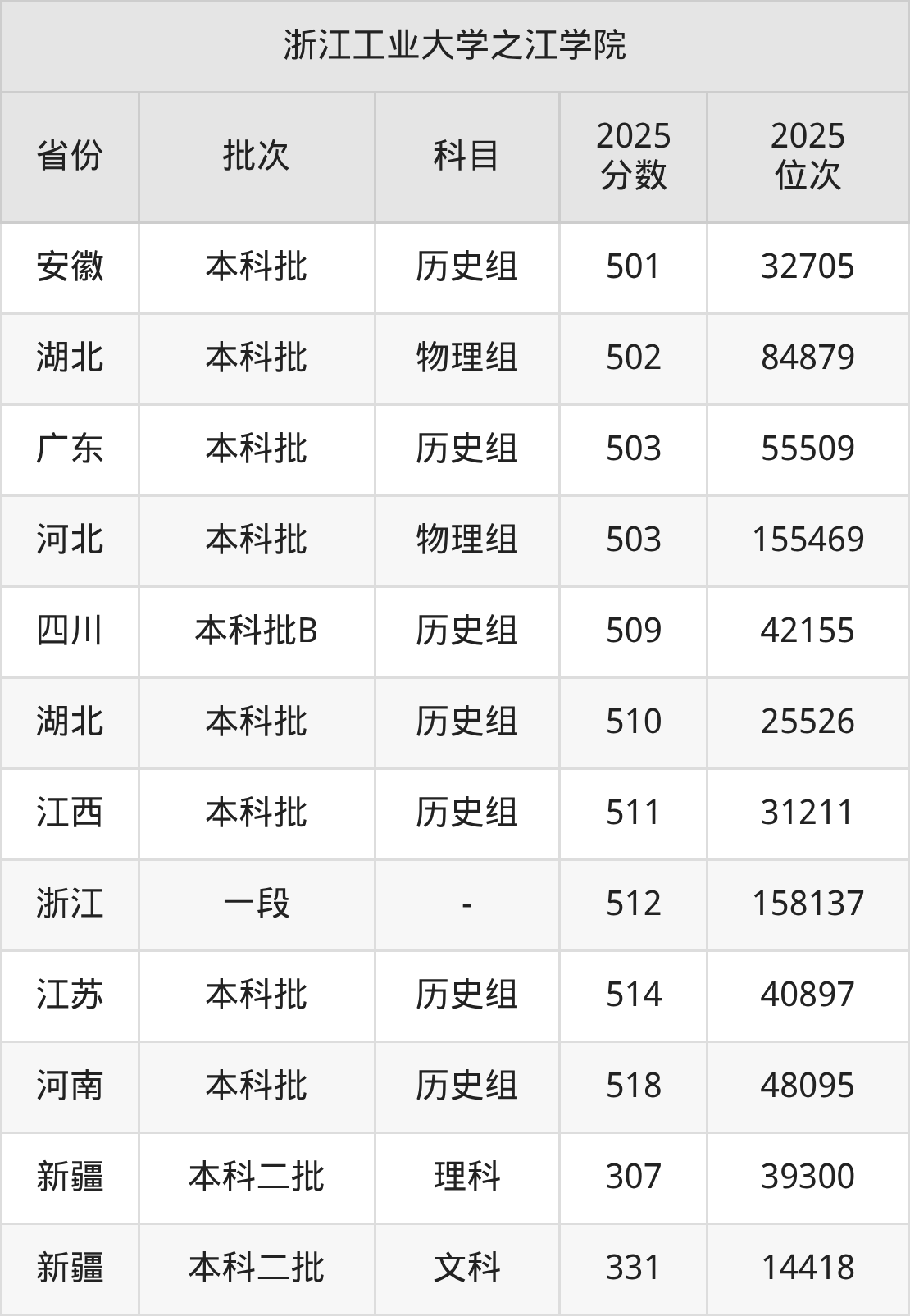 圆梦小编为2026届想要报考浙江工业大学之江学院的同学整理了:浙江工业大学之江学院2025年在全国18个省的最低分及录取位次。