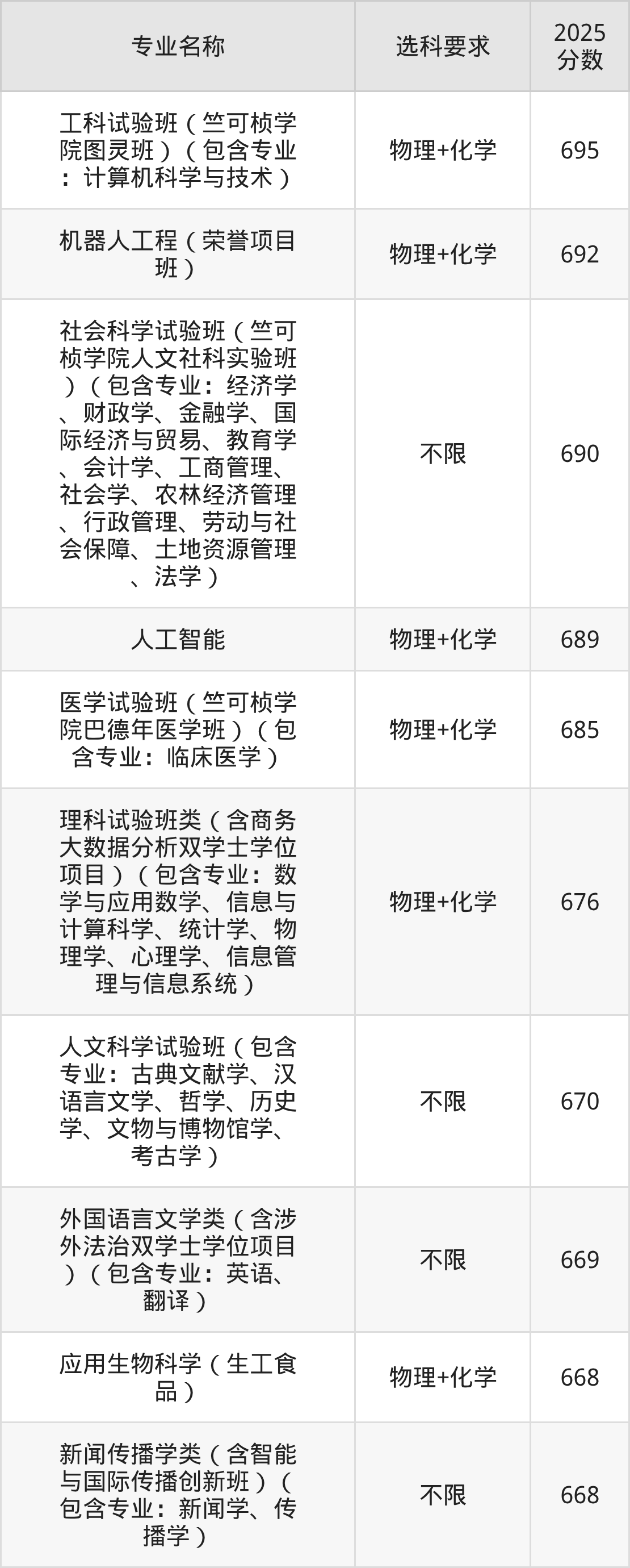 | 工科试验班(竺可桢学 院图灵班)(包含专业 :计算机科学与技术) | 物理+化学 | 681 |