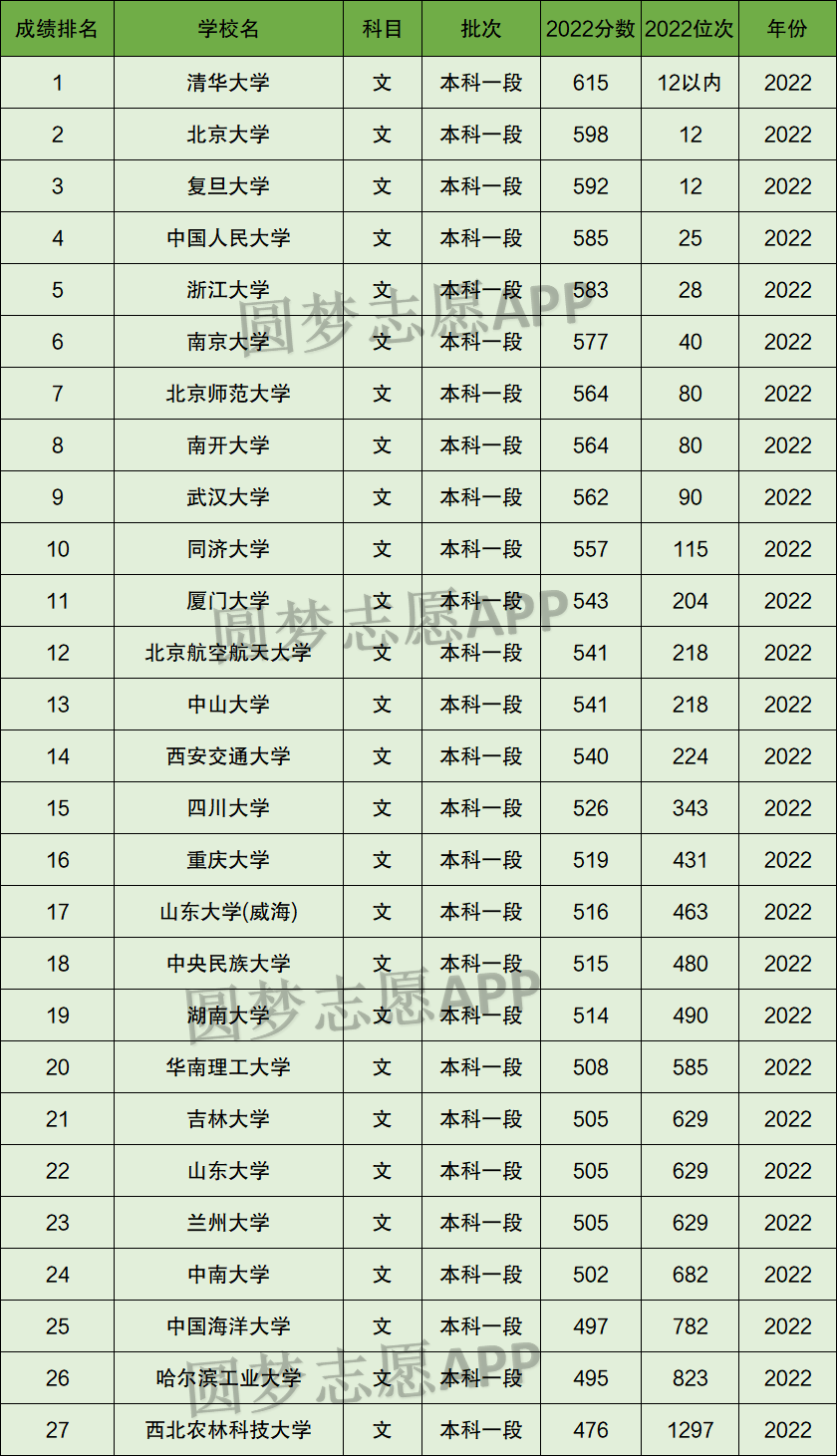 根据985大学在青海省的录取情况我们可以知晓,2022年青海高考985大学文科分数线为476分,最低录取位次为1297名。