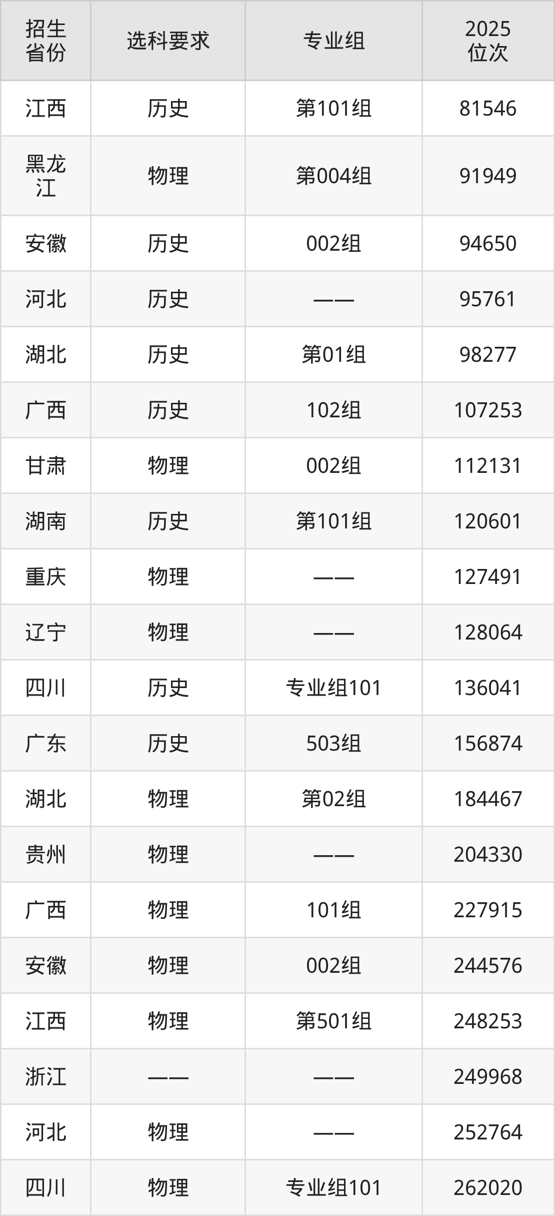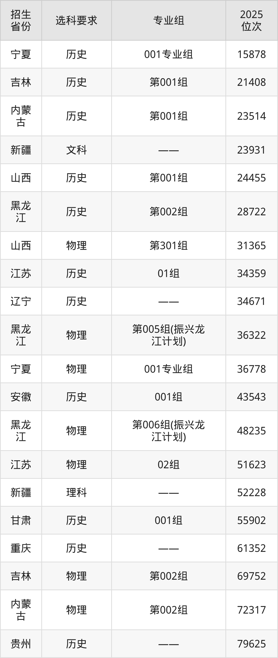 黑龙江农业工程职业技术大学2025年在全国各省的位次差异较大,最高位次是15878位(宁夏历史类)、最低位次是361978位(山东)。各省具体位次请看下图: