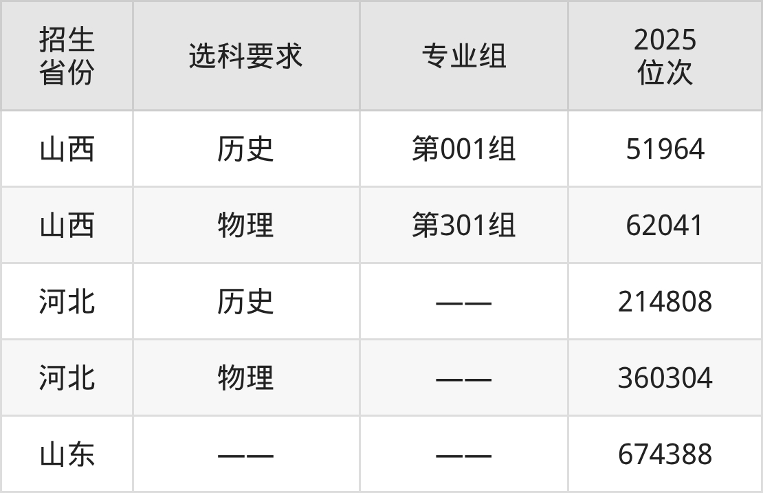 山西信息职业技术学院2025年在全国各省的位次差异较大,最高位次是51964位(山西历史类)、最低位次是674388位(山东)。各省具体位次请看下图: