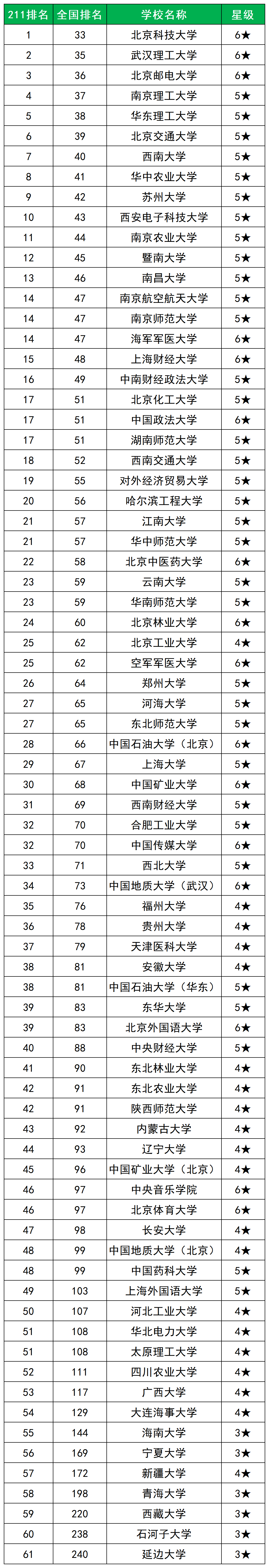 根据上面这份榜单,同学们可以清晰地看见,国内的纯211大学排名在33~240名之间。