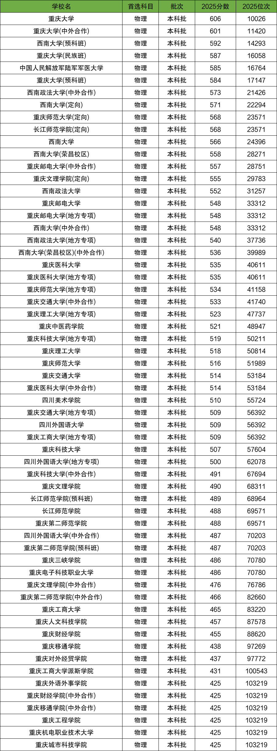 1、重庆2025各校录取分数线排名(物理类本科批)