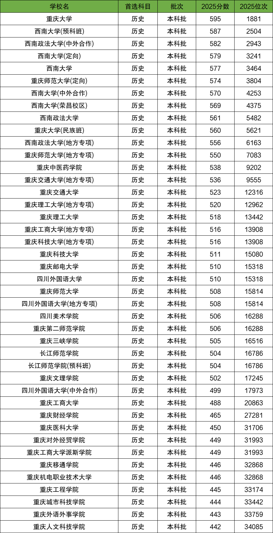 2、重庆2025各校录取分数线排名(历史类本科批)