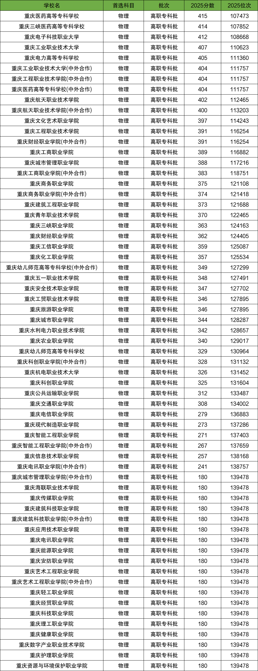 3、重庆2025各校录取分数线排名(物理类专科批)