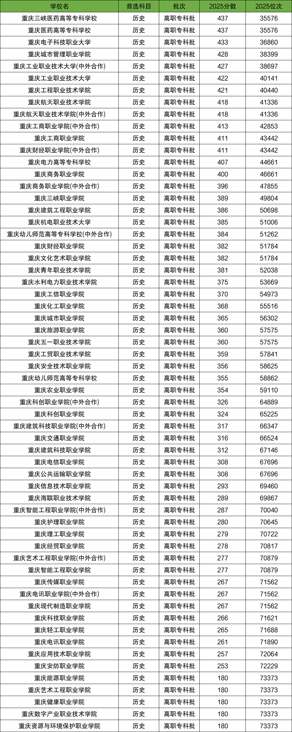 4、重庆2025各校录取分数线排名(历史类专科批)