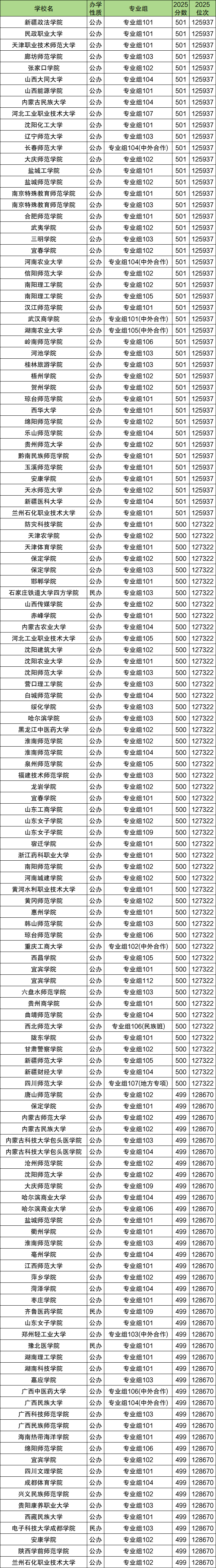500分冲一冲的大学推荐:新疆政法学院101组、山西大同大学104组、河北工业职业技术大学107组、汉江师范学院101组、兰州石化职业技术大学101组等,2025年最低分501分。