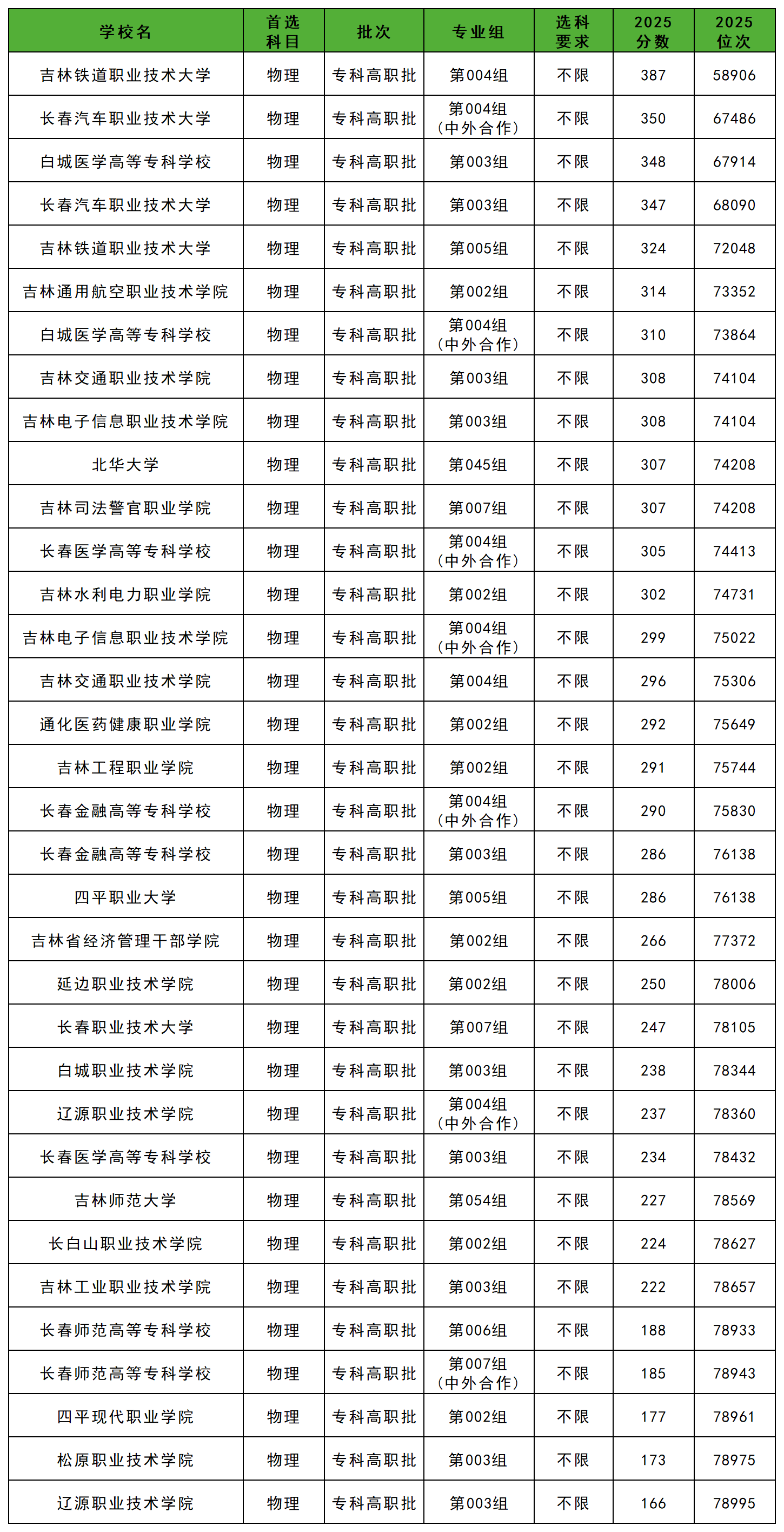 2025年吉林省公办专科大学在吉林省本省物理类的分数线为166分-387分之间,物理类录取分数线最高的是吉林铁道职业技术大学004组,最低分为387分,最低位次为第58906名;其次是长春汽车职业技术大学004组(中外合作),最低分为350分,最低位次为第67486名。
