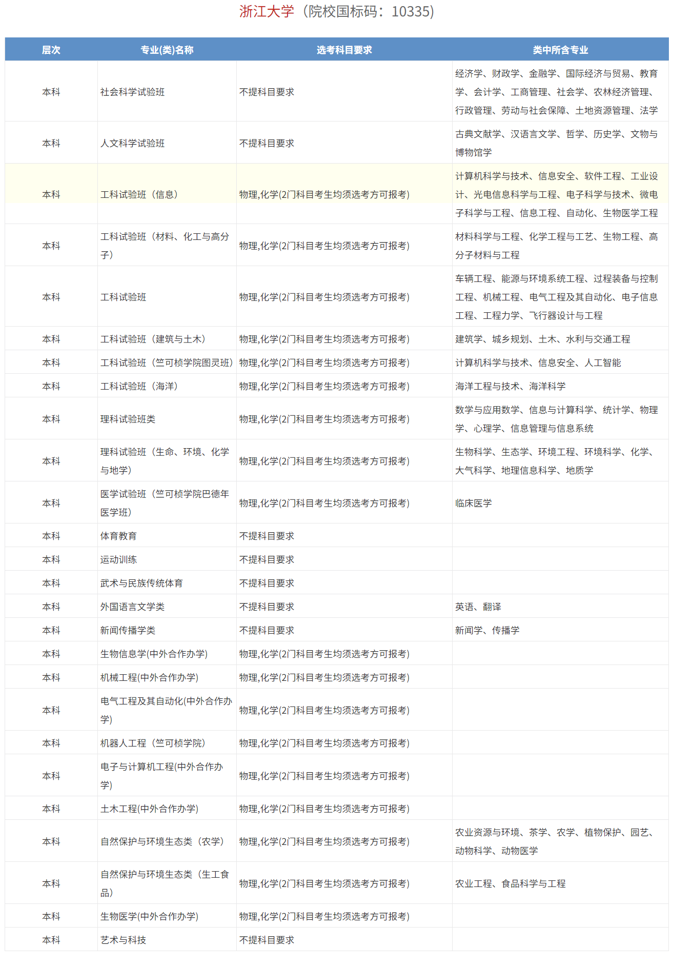必选物理+化学(对应18个专业):工科试验班(信息)、工科试验班(材料、化工与高分子)、工科试验班、工科试验班(建筑与土木)、工科试验班(竺可桢学院图灵班)、工科试验班(海洋)等。