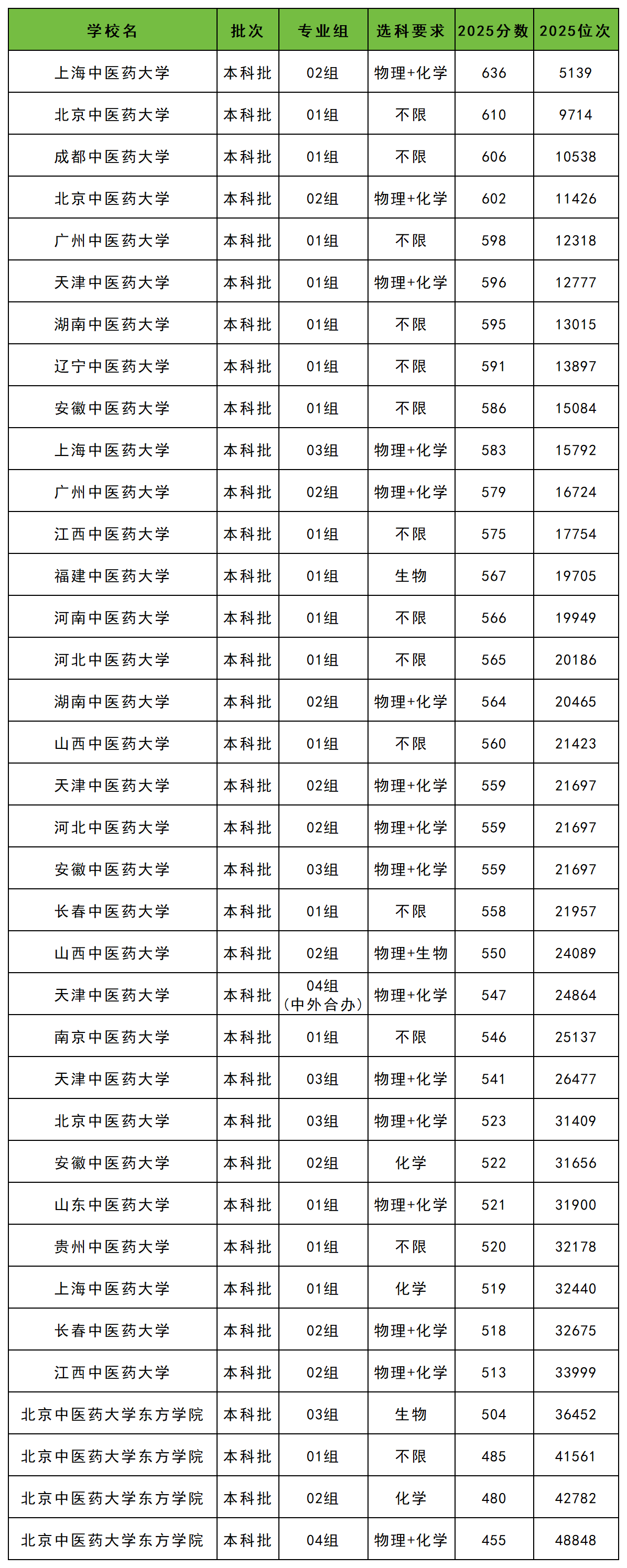 以北京为例,2025年全国中医药大学录取分数线位于455分到636分之间,最难考的是上海中医药大学02组,学校2025年最低是636分,录取最低位次5139名。