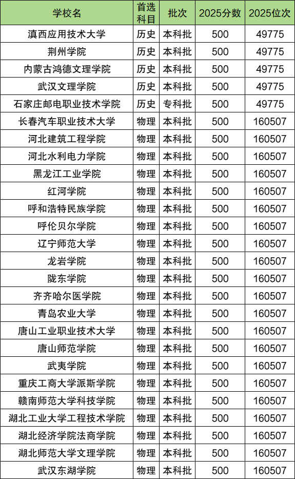 河北高考500分物理类位次是160507名,对应能上的学校有河北水利电力学院、辽宁师范大学、齐齐哈尔医学院、青岛农业大学、唐山师范学院等;历史类500分位次是49775名,对应的大学有滇西应用技术大学、武汉文理学院、石家庄职业技术学院等,具体名单如下表所示: