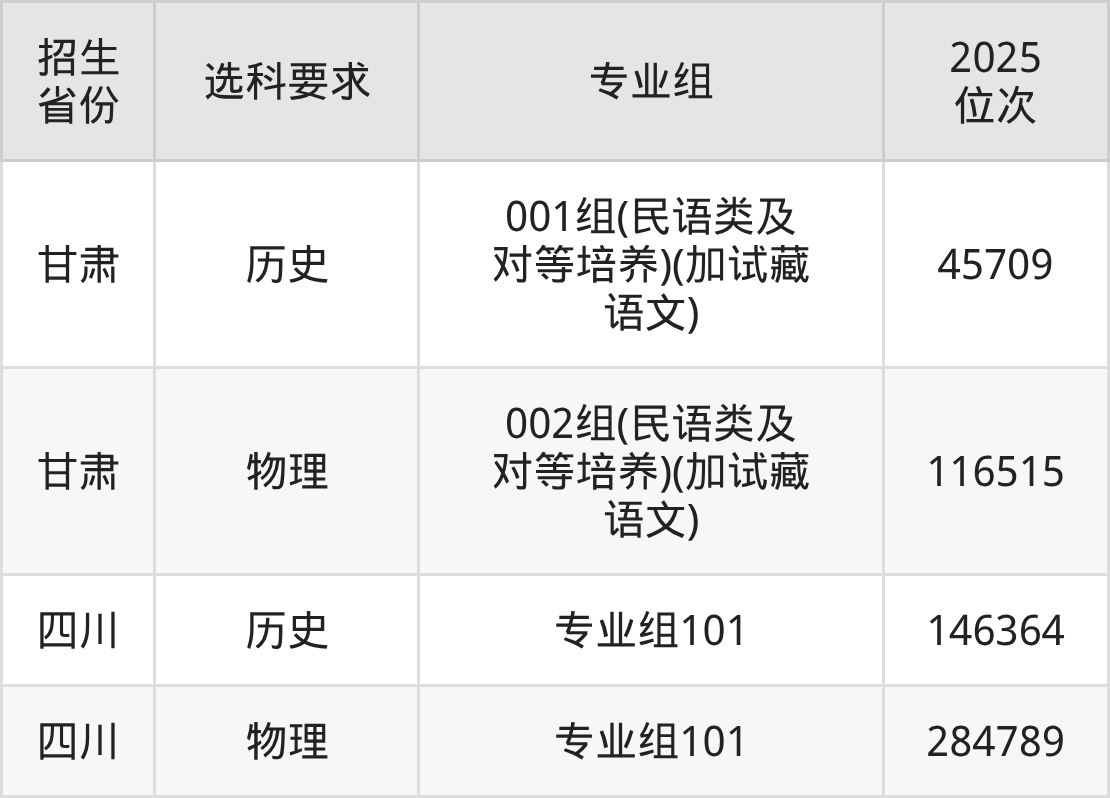 甘孜职业学院2025年在全国各省的位次差异较大,最高位次是45709位(甘肃历史类)、最低位次是284789位(四川物理类)。各省具体位次请看下图: