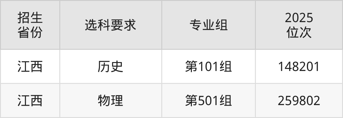 九江理工职业学院2025年的位次差异较大,最高位次是148201位(江西历史类)、最低位次是259802位(江西物理类)。具体位次请看下图: