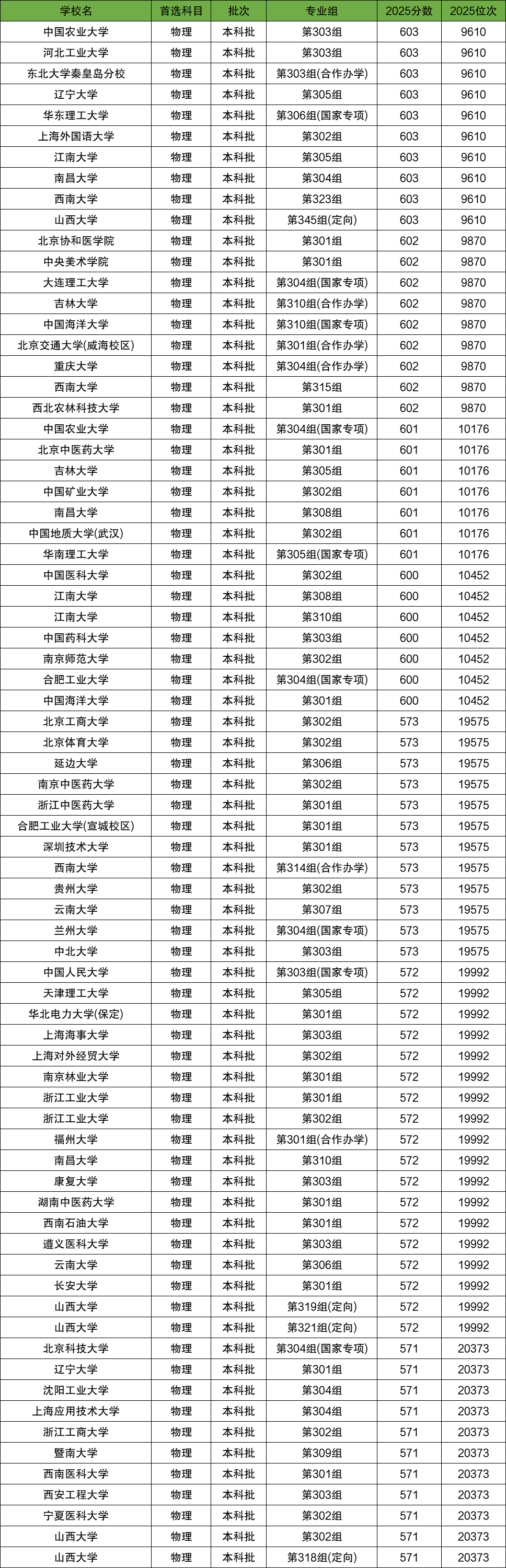 二、山西物理类高考位次对应大学名单