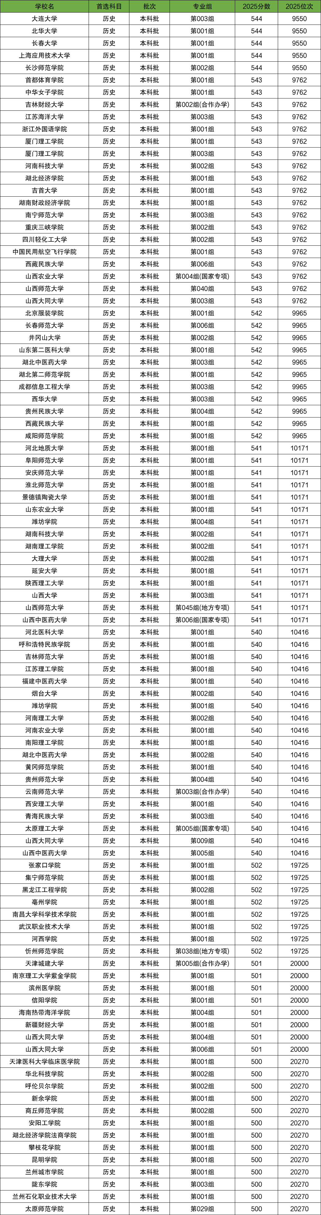 三、山西历史类高考位次对应大学名单