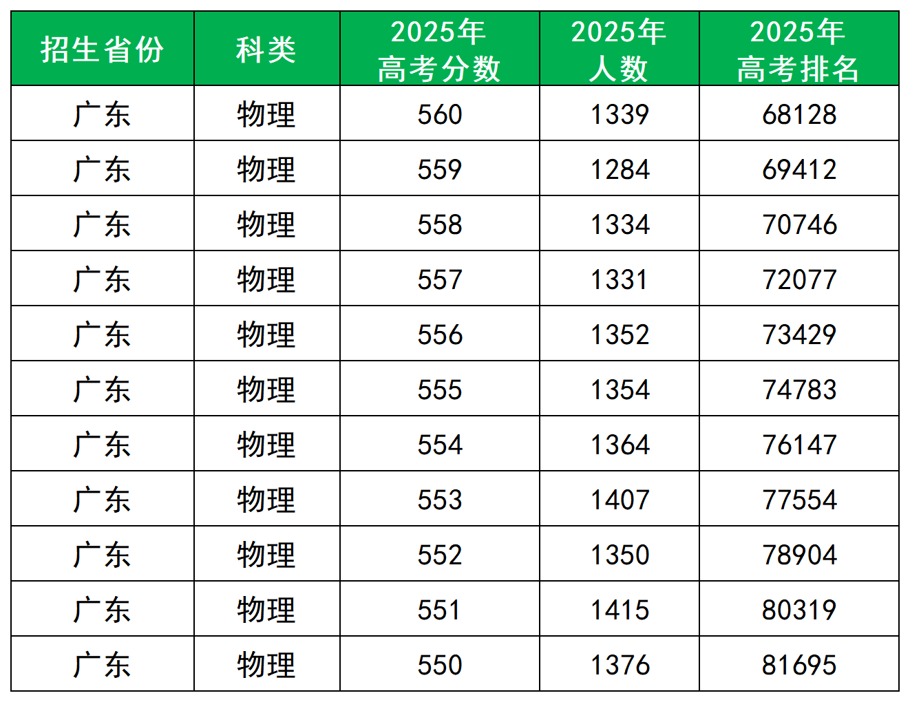 利用等效分查询2025年广东高考一分一段表,555分对应省排名73430-74783名。