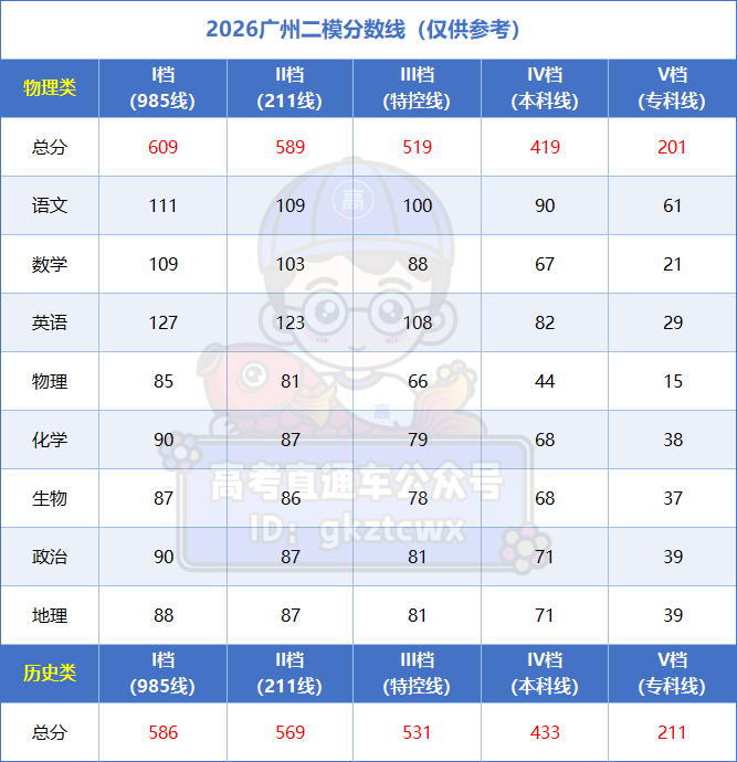 2026年广州二模分数线已公布。历史类本科线433分,特控线531分,985线586分;物理类本科线419分,特控线519分,985线609分。化学原始分100分能赋到100分,生物97分能赋到100分,政治91分能赋到100分,地理91分能赋到100分。