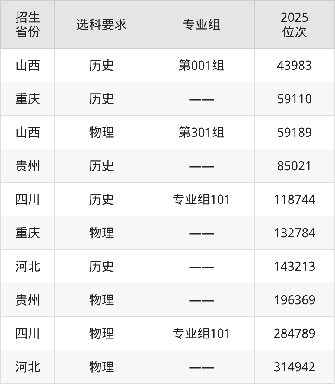 西昌民族幼儿师范高等专科学校2025年在全国各省的位次差异较大,最高位次是43983位(山西历史类)、最低位次是314942位(河北物理类)。各省具体位次请看下图: