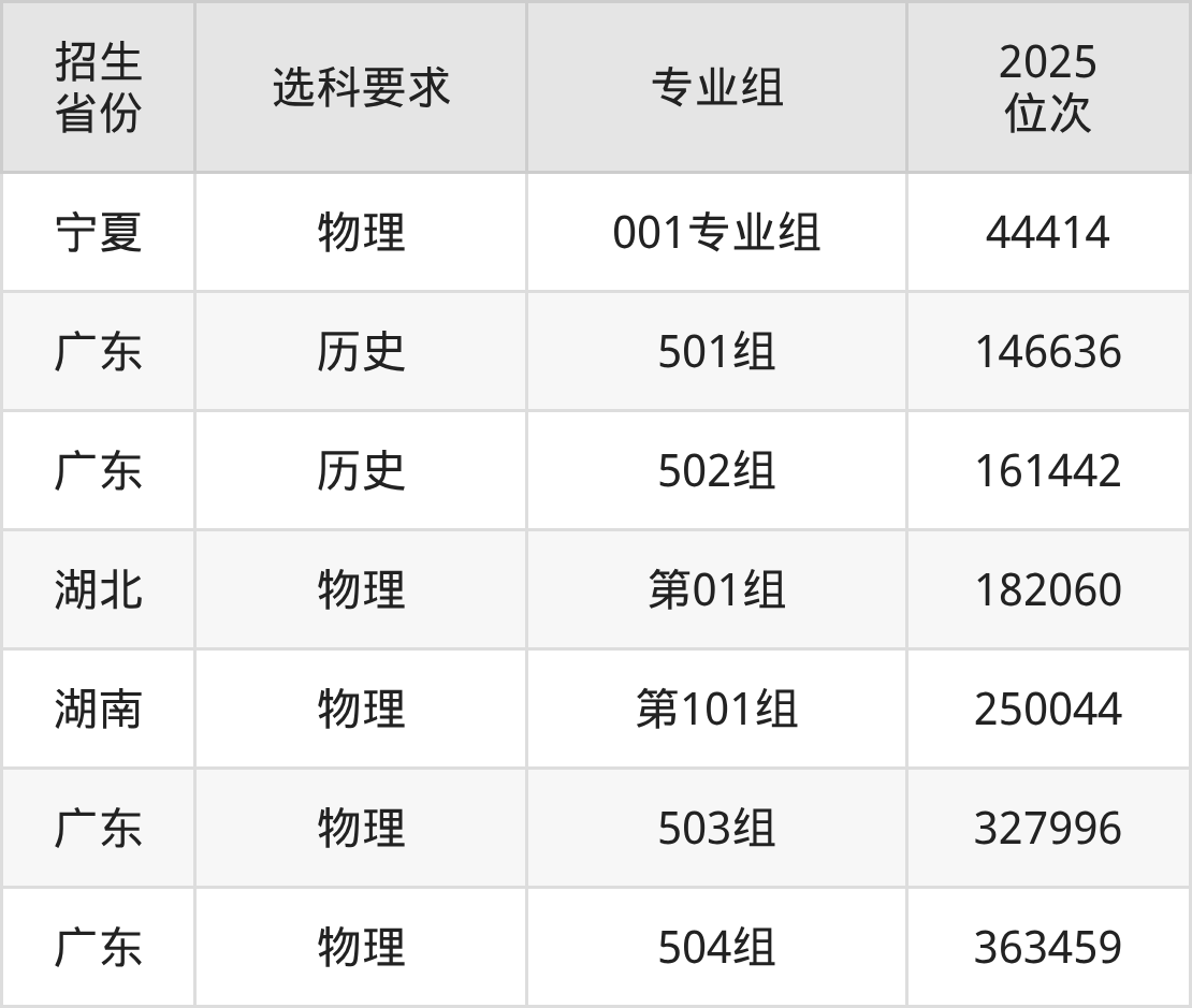 广东茂名农林科技职业学院2025年在全国各省的位次差异较大,最高位次是44414位(宁夏物理类)、最低位次是363459位(广东物理类)。各省具体位次请看下图: