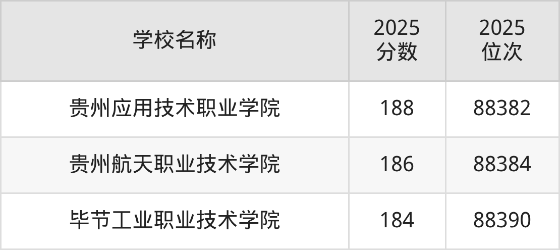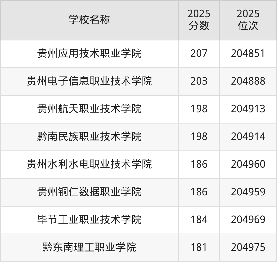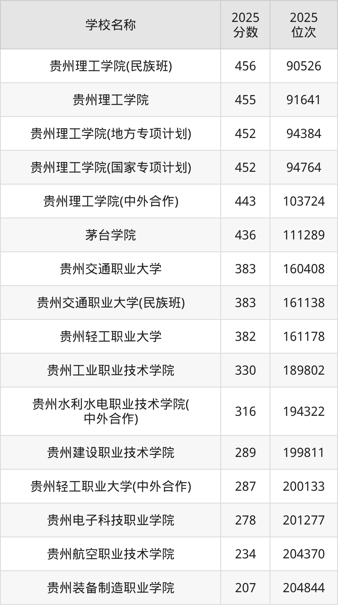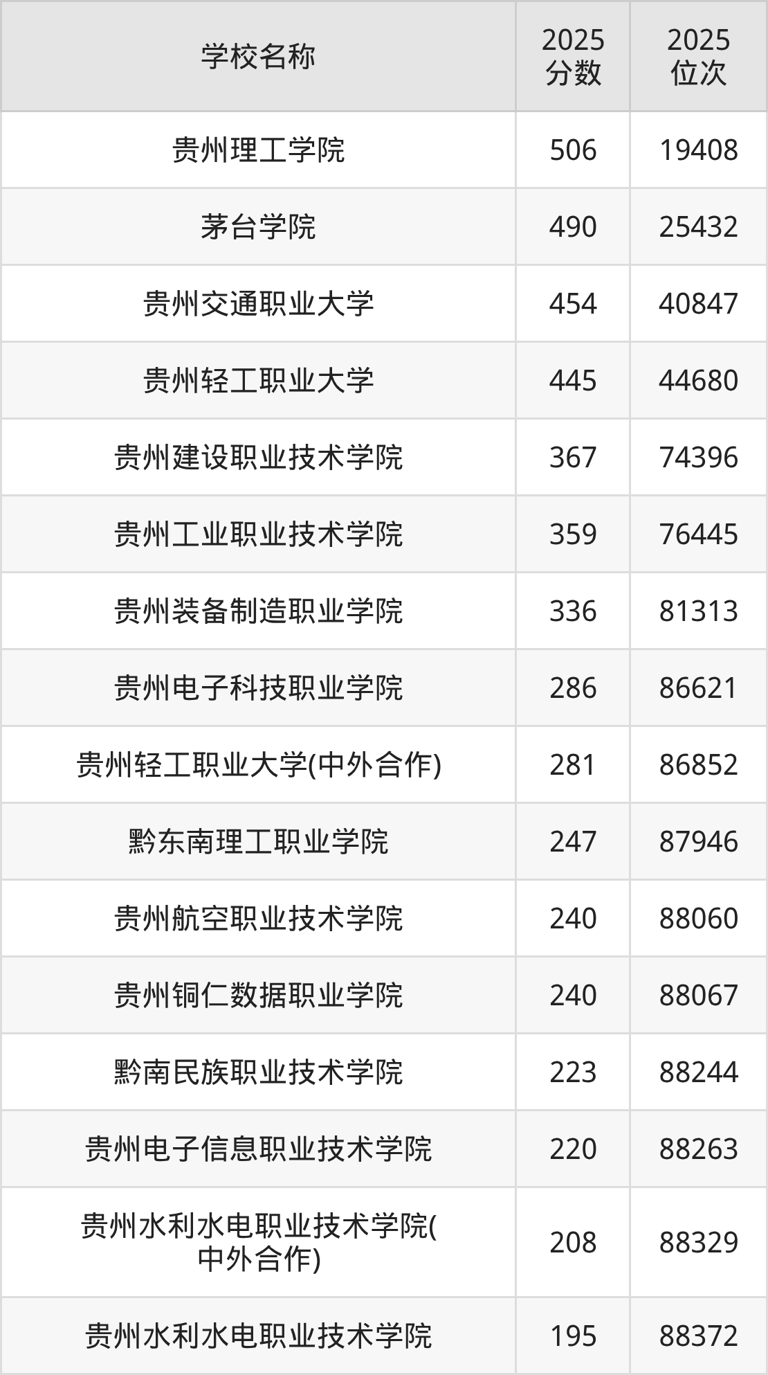 下文为2025年贵州省理工类大学在贵州历史类录取分数线和位次排名表,供大家参考: