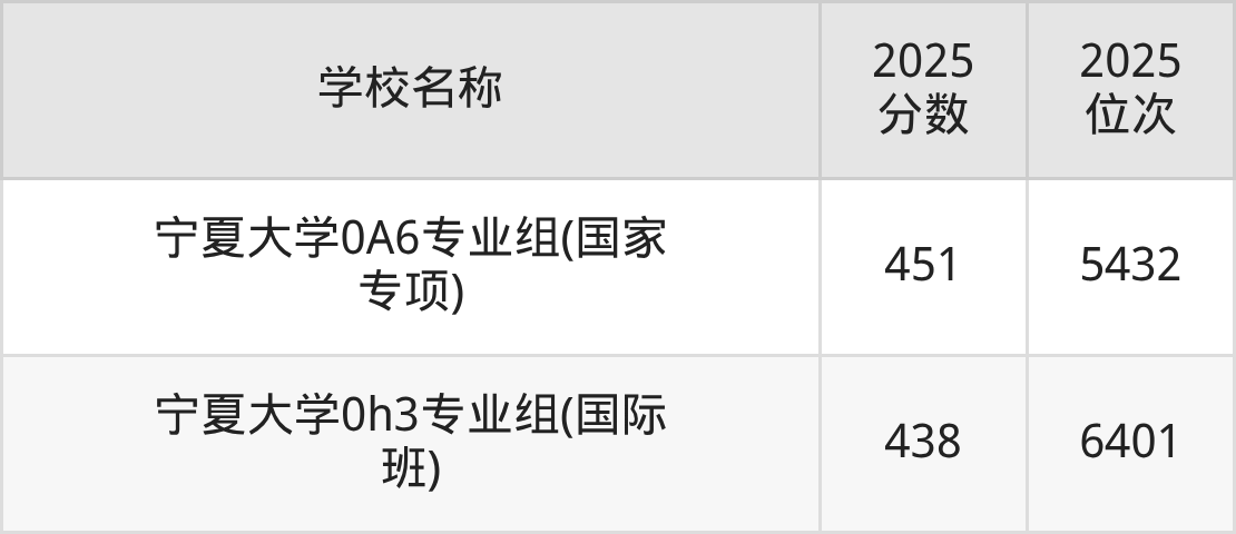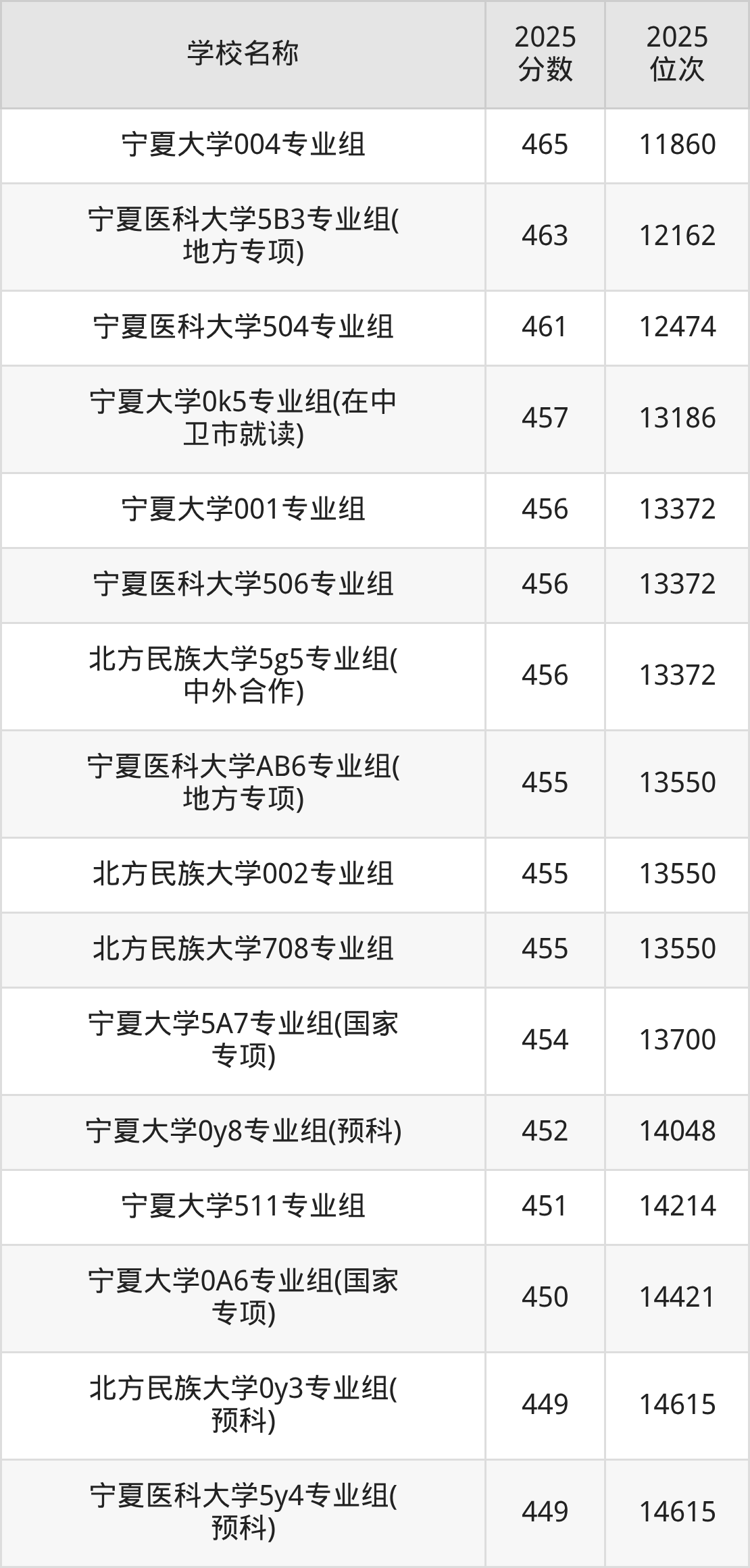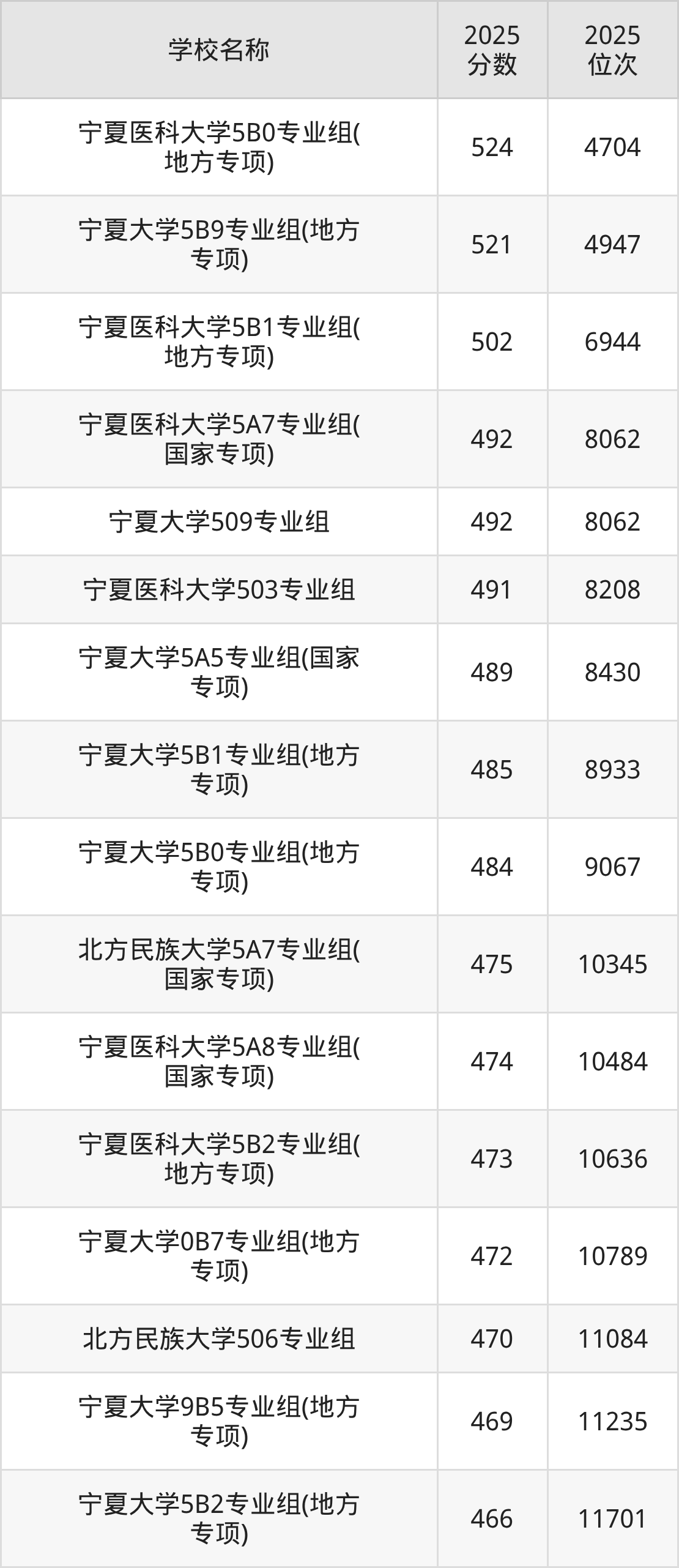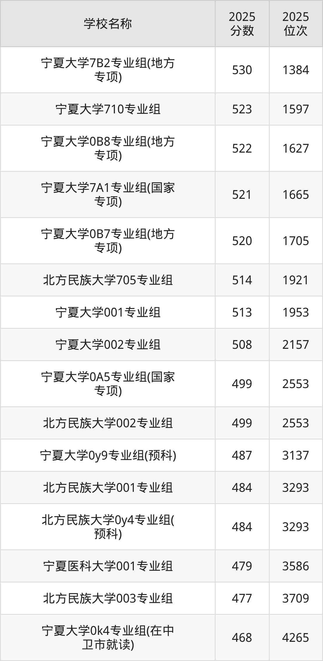 下文为2025年宁夏回族自治区含保研资格的大学在宁夏历史类录取分数线和位次排名表,供大家参考: