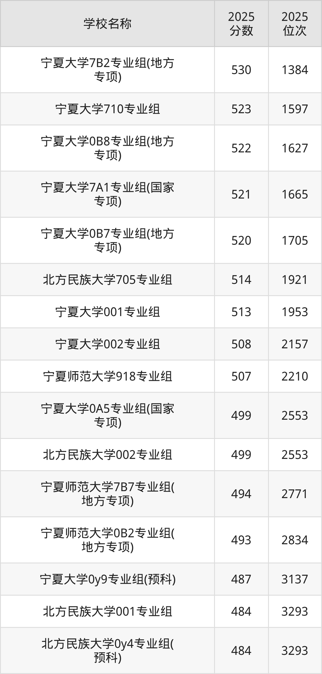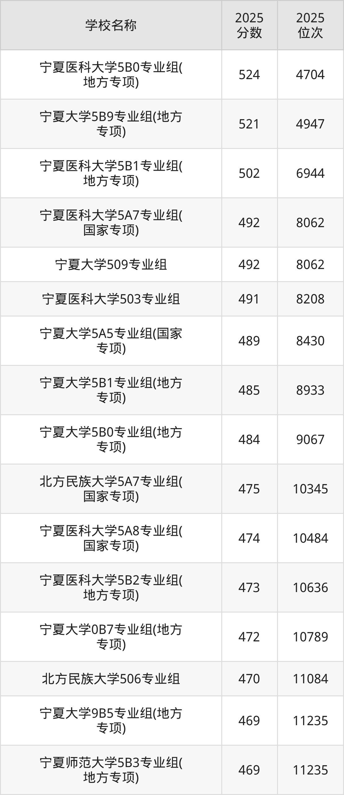 下文为2025年宁夏回族自治区一本大学在宁夏历史类录取分数线和位次排名表,供大家参考: