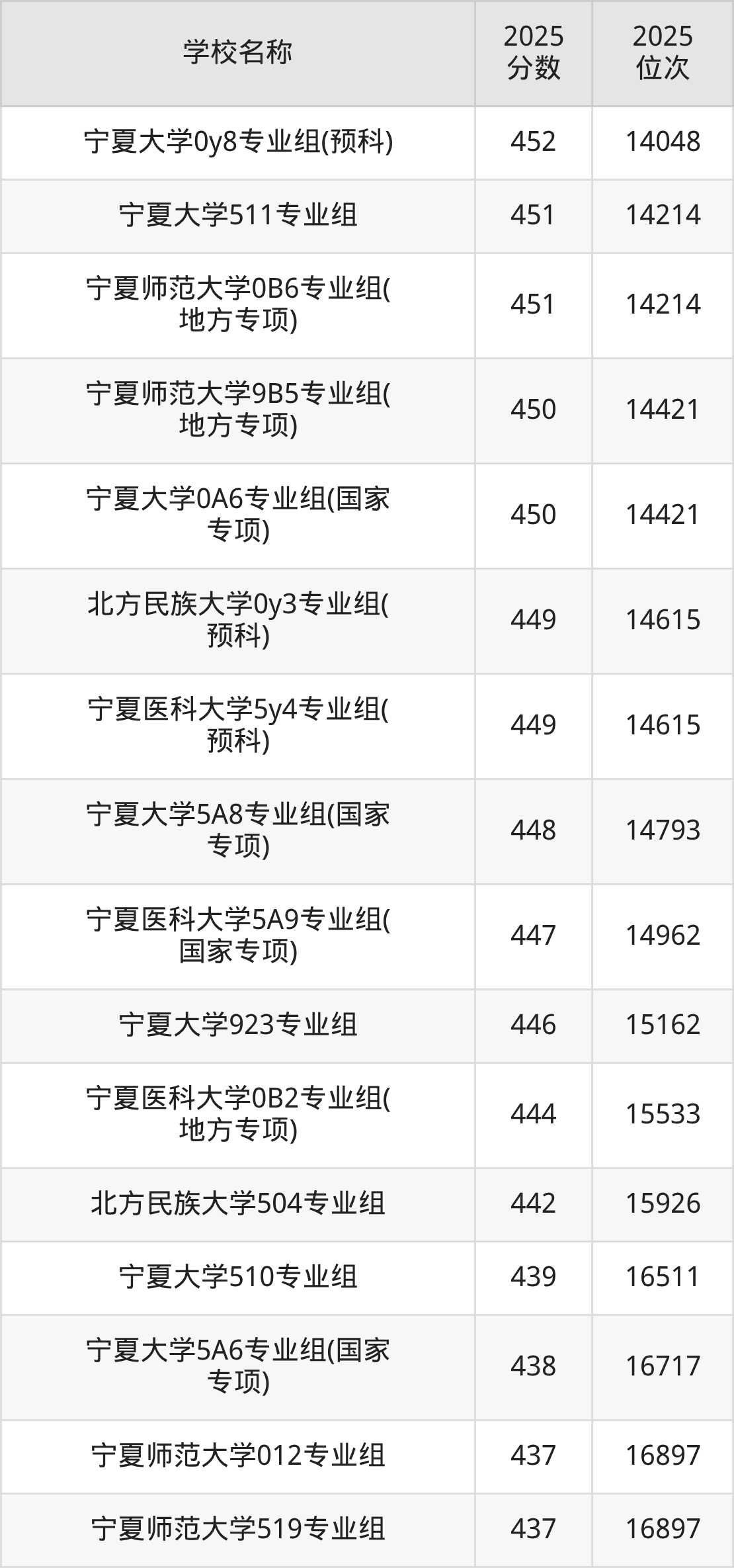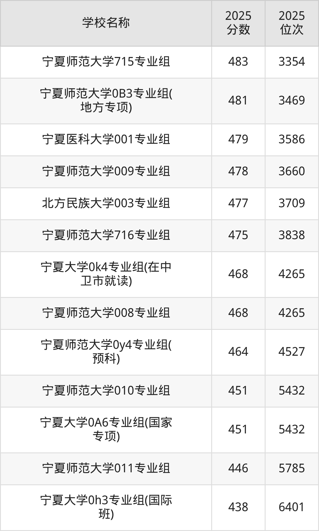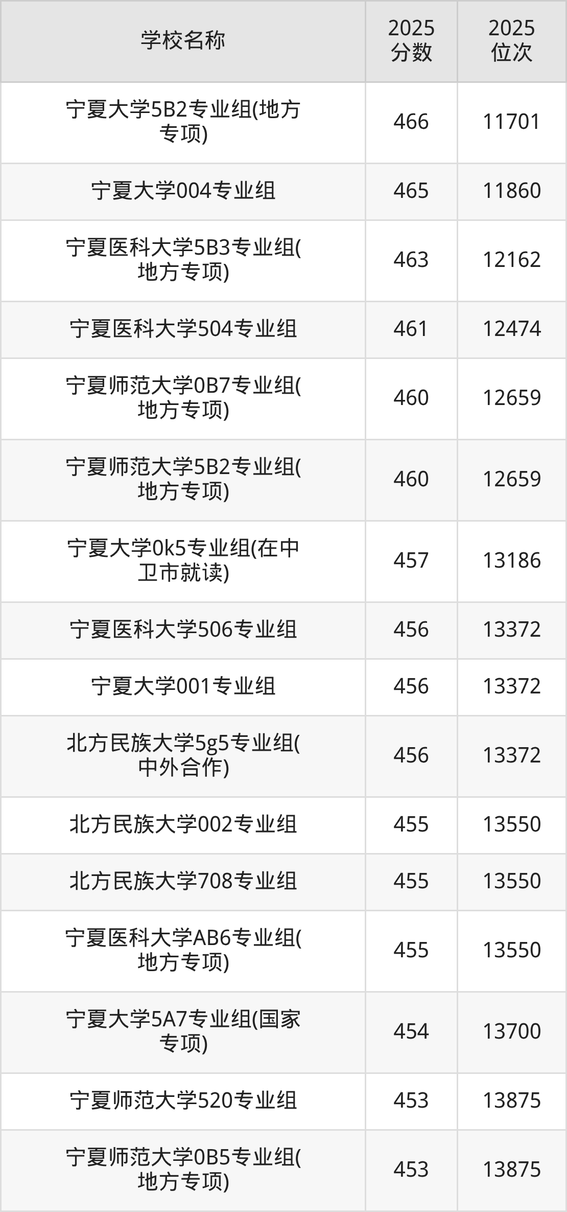 下文为2025年宁夏回族自治区一本大学在宁夏物理类录取分数线和位次排名表,供大家参考:
