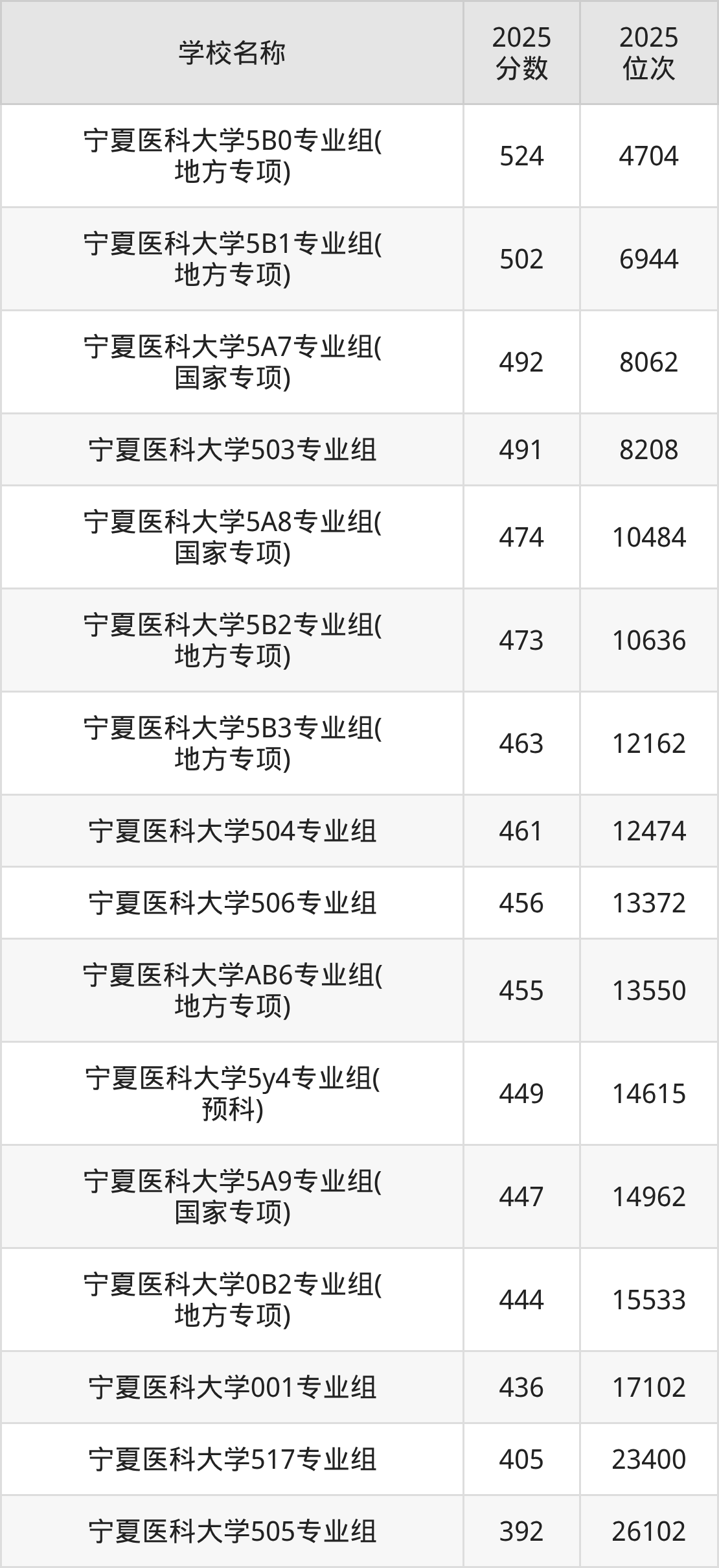 下文为2025年银川市医科大学在宁夏物理类录取分数线和位次排名表,供大家参考: