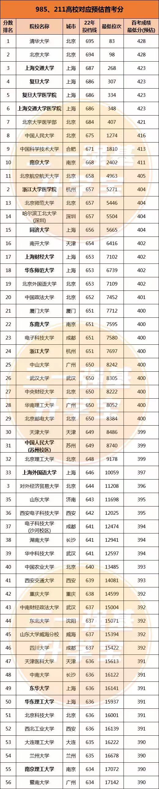 预估首考分数在390分以上的985、211高校共有56所,其中大部分高校预估首考分数都集中在390-410分这个区间。有少数顶尖的C9高校预估首考要求达到了420分以上,比如:北京大学、复旦大学、上海交通大学等。