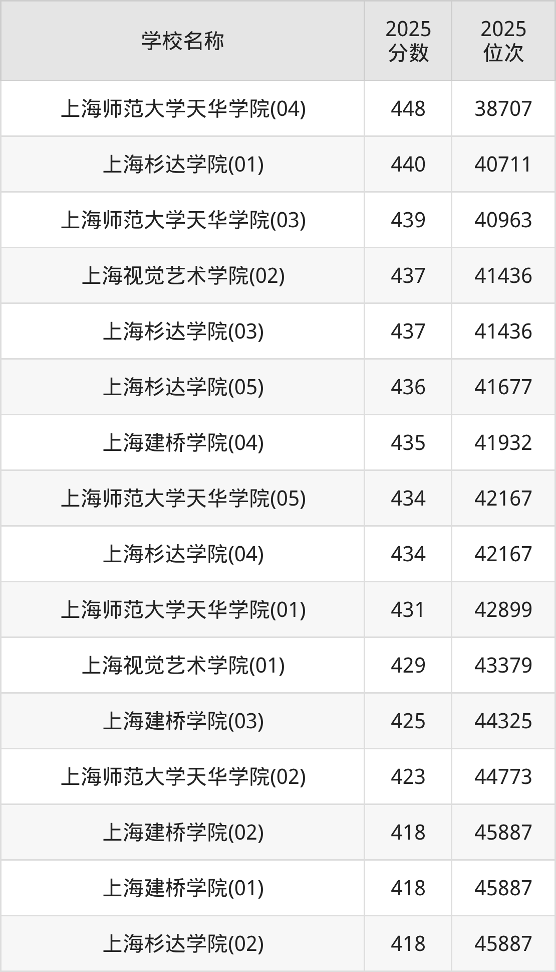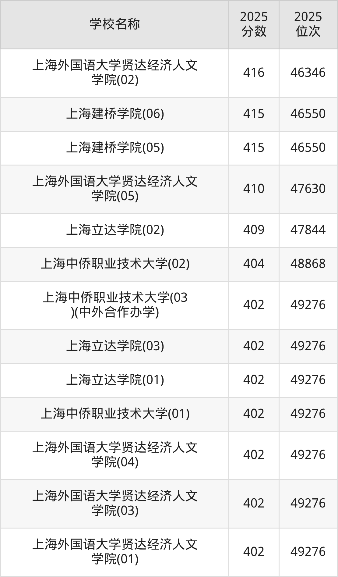 下文为2025年上海市民办二本大学在上海录取分数线和位次排名表,供大家参考: