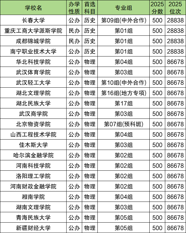 湖北高考500分物理类位次是86678名,对应能上的学校有武汉体育学院第03组、武汉商学院第03组、哈尔滨金融学院第02组、洛阳理工学院第02组等;历史类500分位次是28838名,对应的大学有重庆工商大学派斯学院第01组、成都锦城学院第01组、南宁职业技术大学第01组等,具体名单如下表所示: