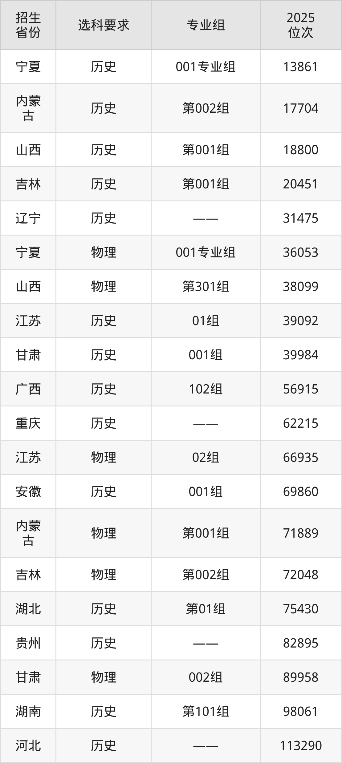 河北化工医药职业技术学院2025年在全国各省的位次差异较大,最高位次是13861位(宁夏历史类)、最低位次是467426位(山东)。各省具体位次请看下图: