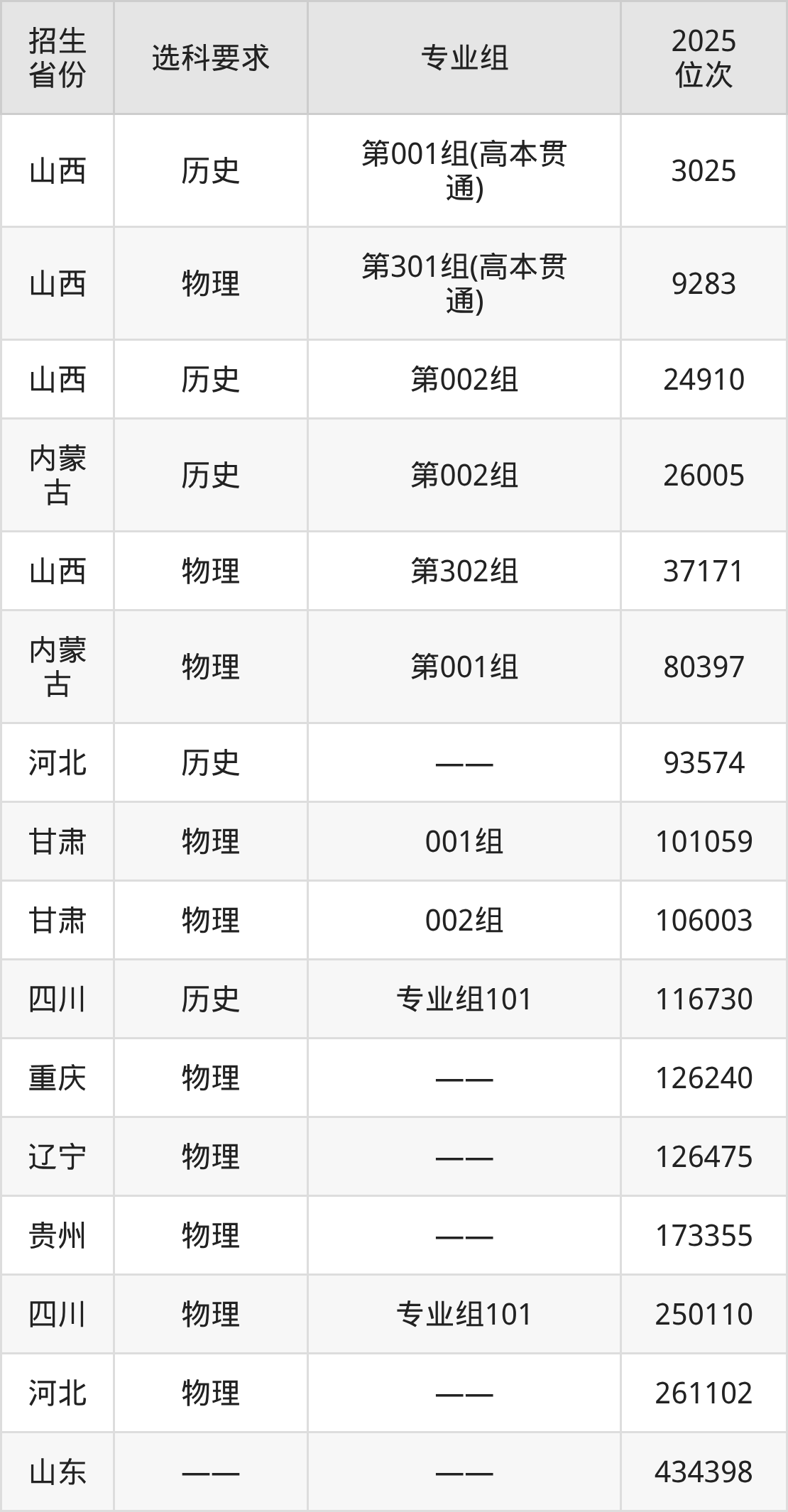 山西工程职业学院2025年在全国各省的位次差异较大,最高位次是3025位(山西历史类)、最低位次是434398位(山东)。各省具体位次请看下图: