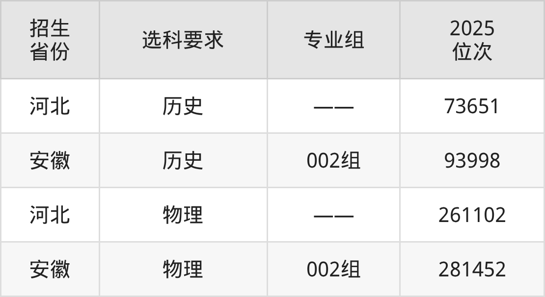 亳州职业技术学院2025年在全国各省的位次差异较大,最高位次是73651位(河北历史类)、最低位次是281452位(安徽物理类)。各省具体位次请看下图: