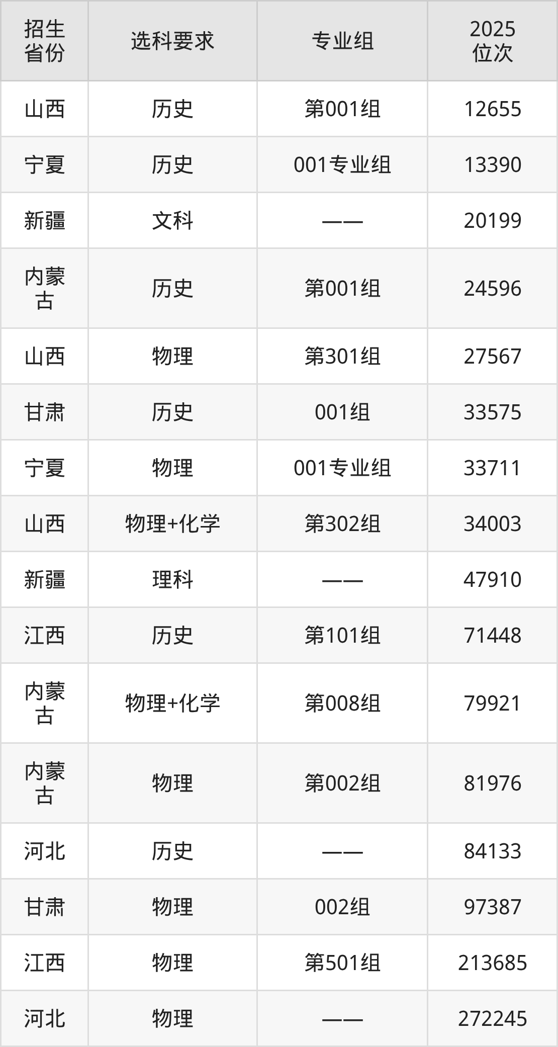 乌兰察布医学高等专科学校2025年在全国各省的位次差异较大,最高位次是12655位(山西历史类)、最低位次是272245位(河北物理类)。各省具体位次请看下图: