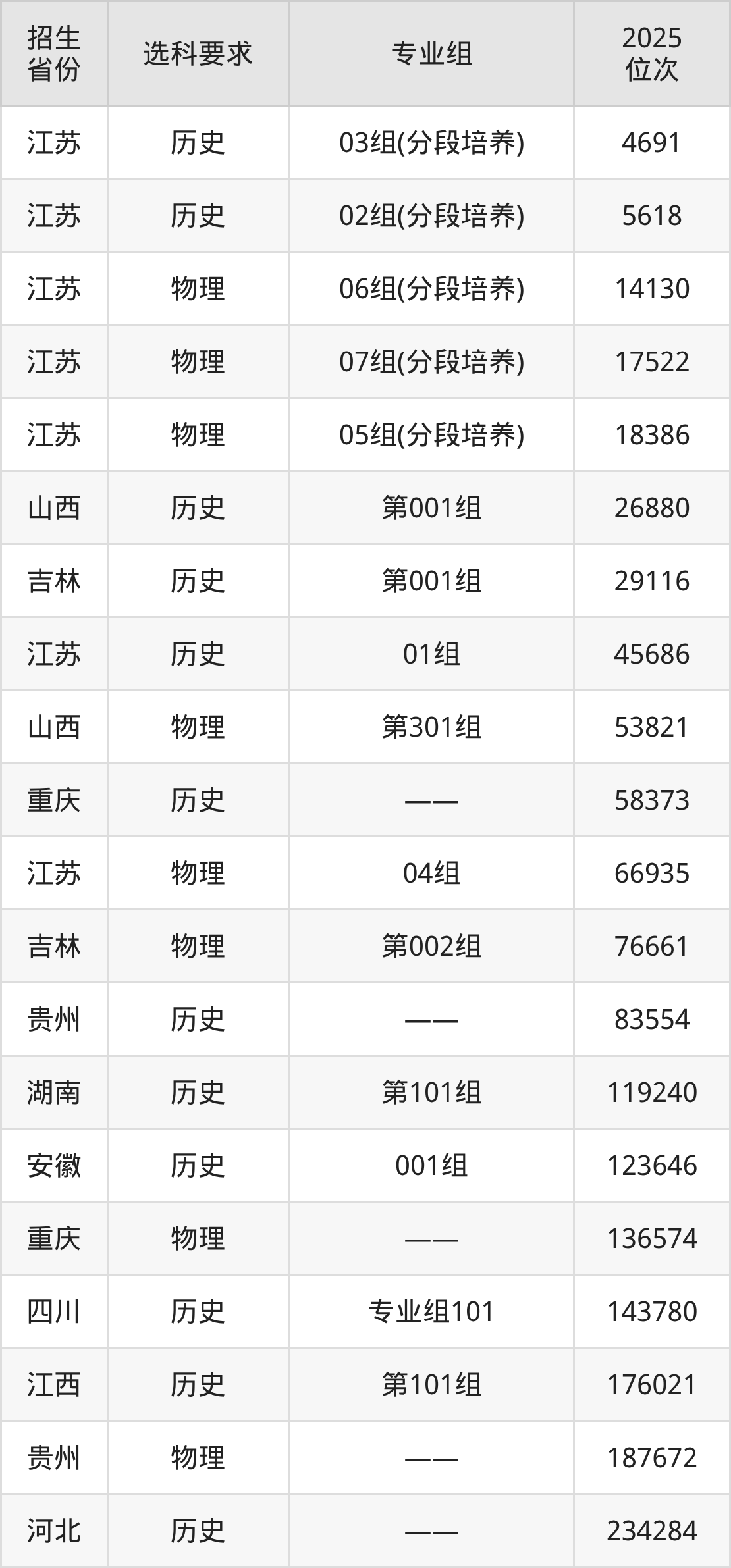 江海职业技术学院2025年在全国各省的位次差异较大,最高位次是4691位(江苏历史类)、最低位次是654121位(山东)。各省具体位次请看下图: