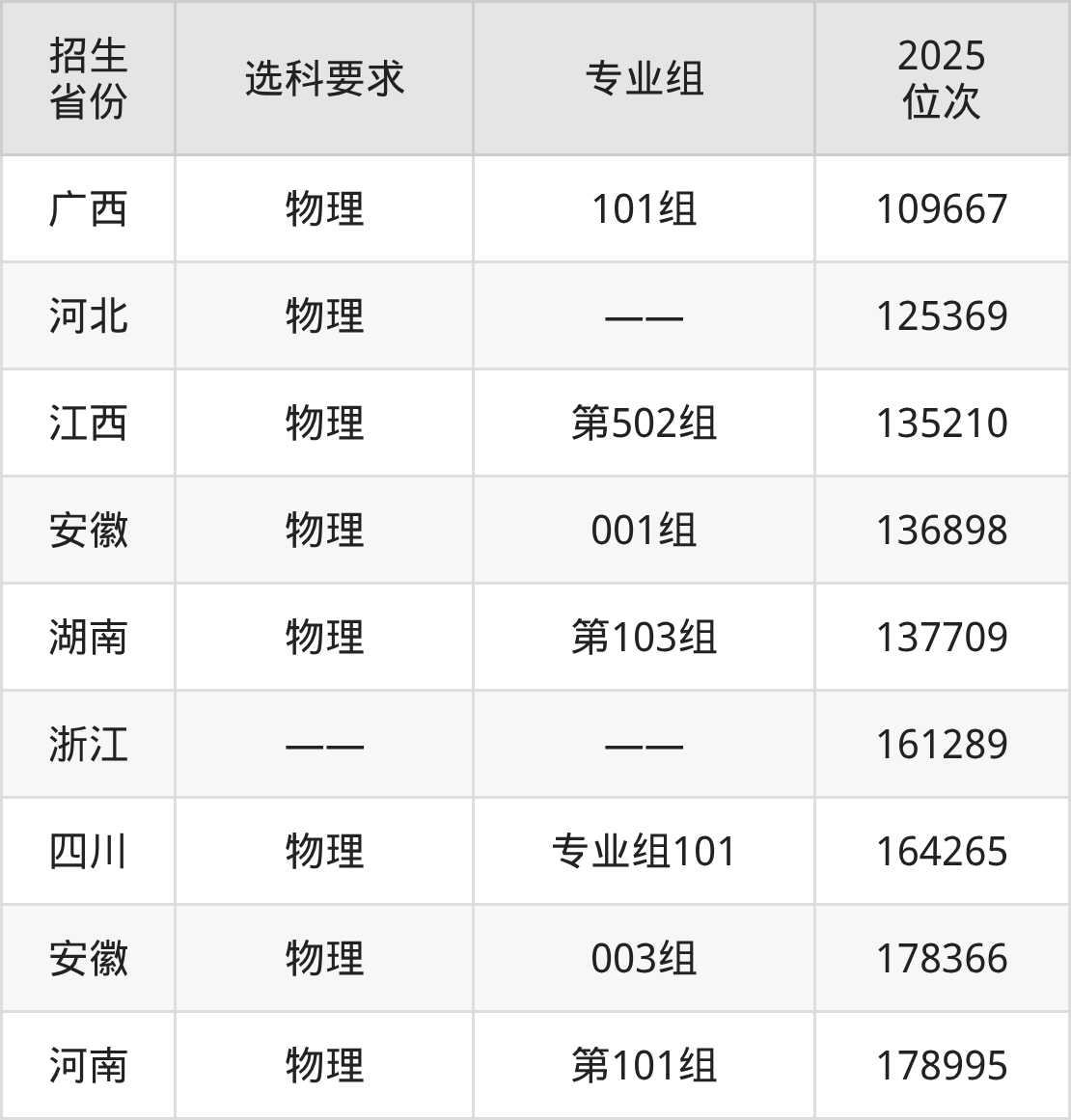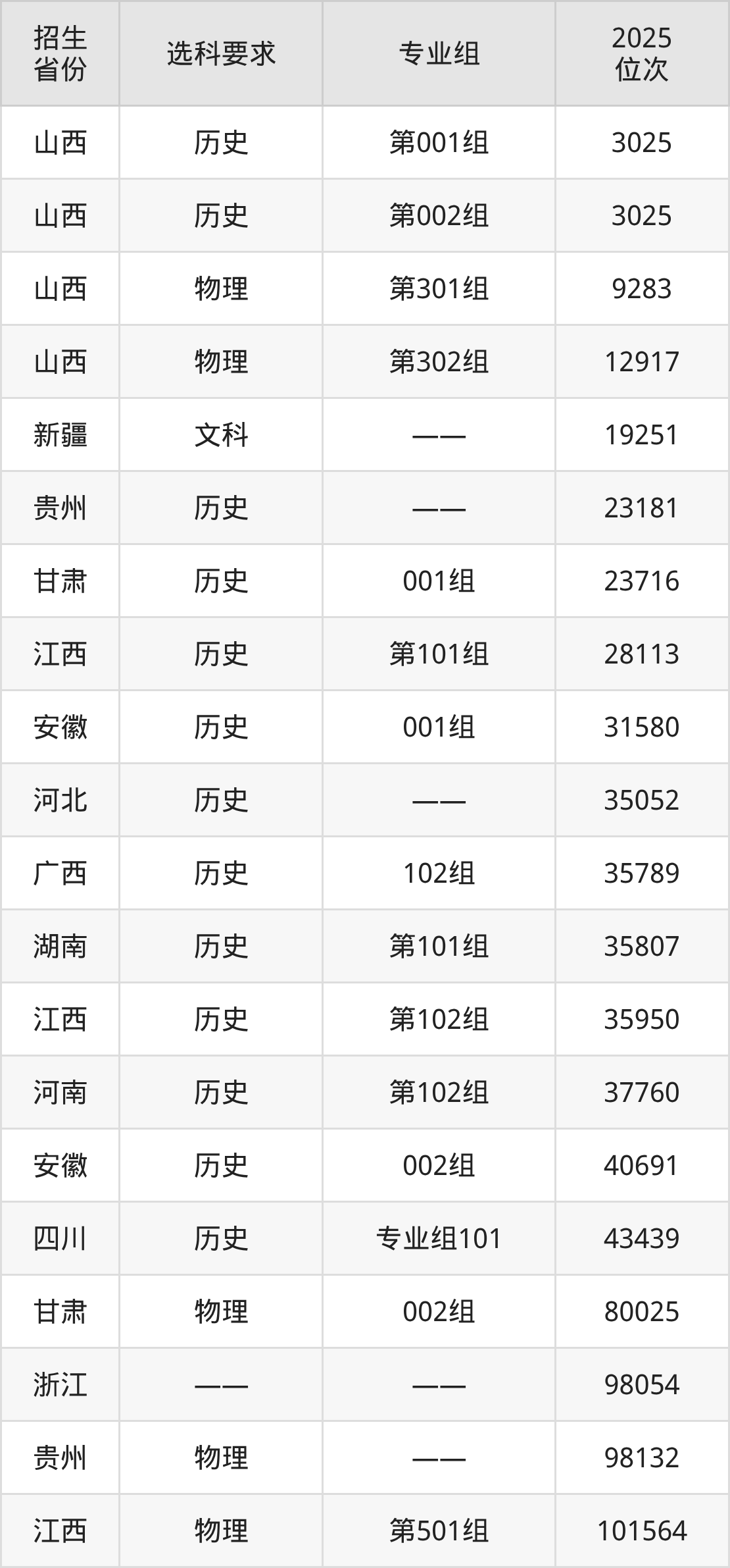 金华职业技术大学2025年在全国各省的位次差异较大,最高位次是3025位(山西历史类)、最低位次是178995位(河南物理类)。各省具体位次请看下图: