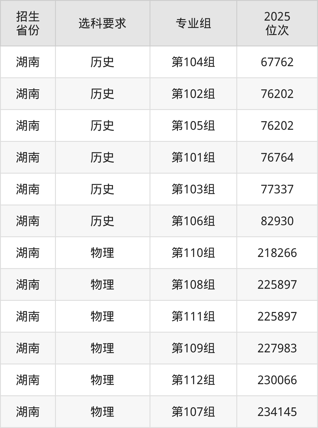 湖南艺术职业学院2025年的位次差异较大,最高位次是67762位(湖南历史类)、最低位次是234145位(湖南物理类)。具体位次请看下图: