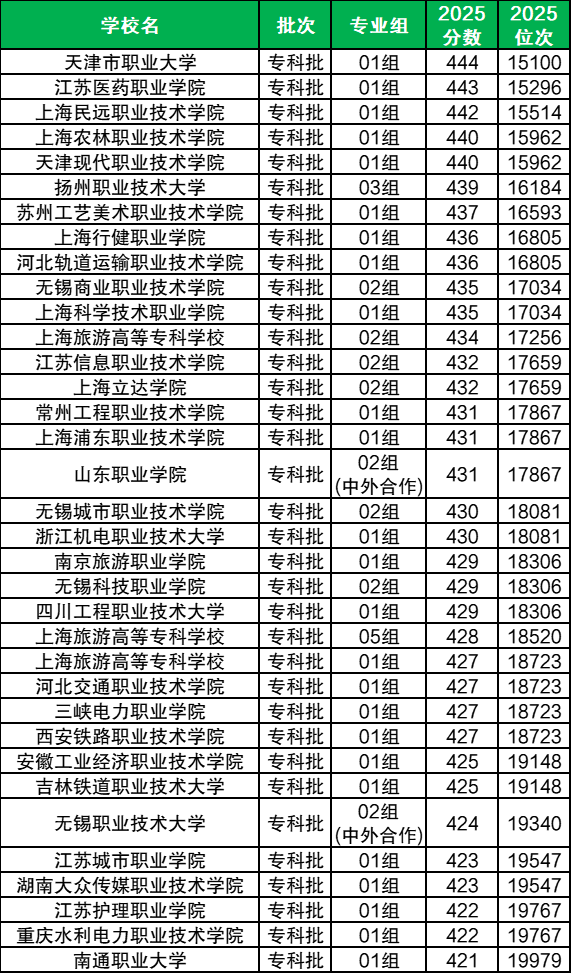 本文也为专科批考生单独整理出2025年江苏专科批分数位次对应大学,以历史类1.5万-1.7万名、物理类4万-4.2万名为例,整理出具体分位次对应大学名单。