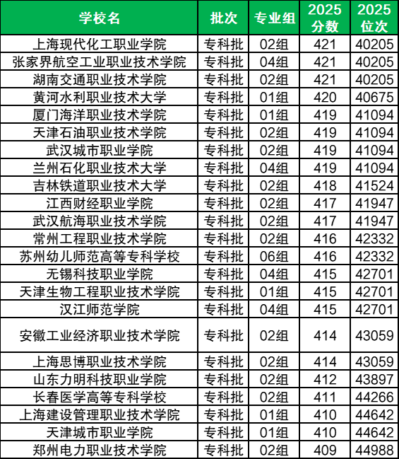 最高录取位次(40205名)对应的院校专业组是:上海现代化工职业学院02组、张家界航空工业职业技术学院04组、湖南交通职业技术学院02组(421分);