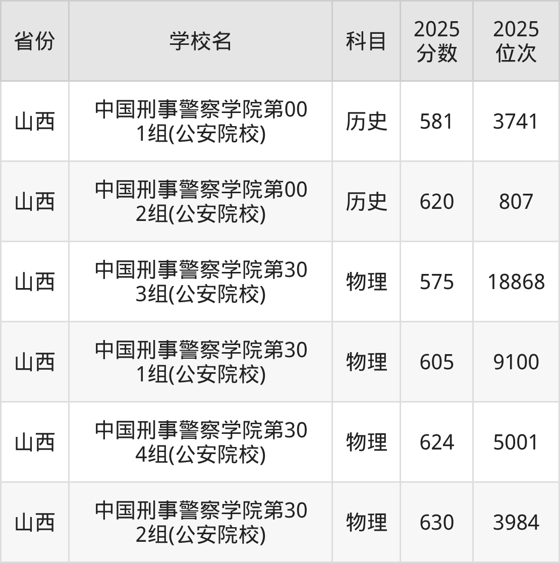 2025年中国刑事警察学院在省外录取分数线范围整体位于575分到630分之间,录取分数线最低在山西物理(第303组(公安院校))、录取分数线最高在山西物理(第302组(公安院校))。