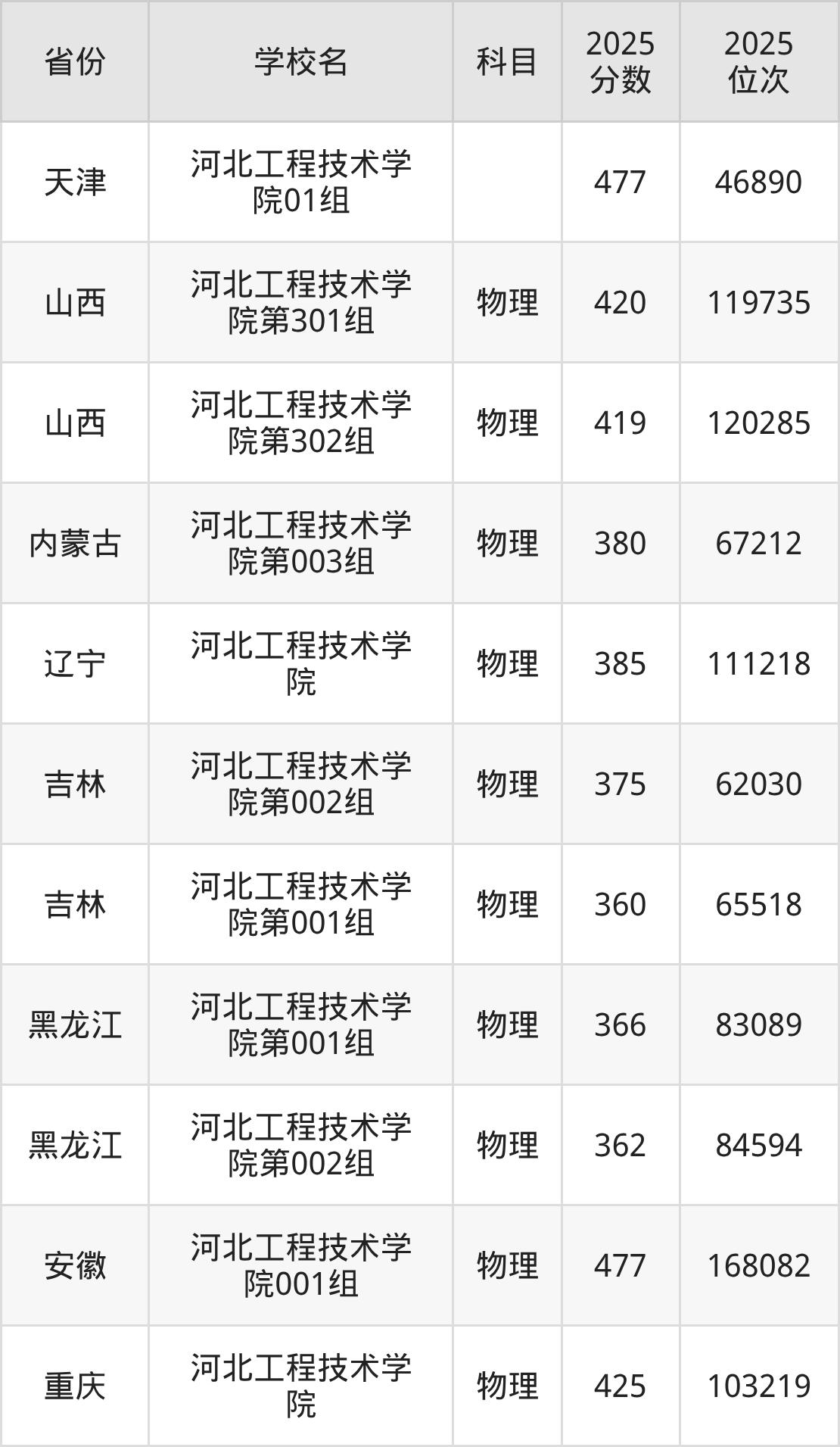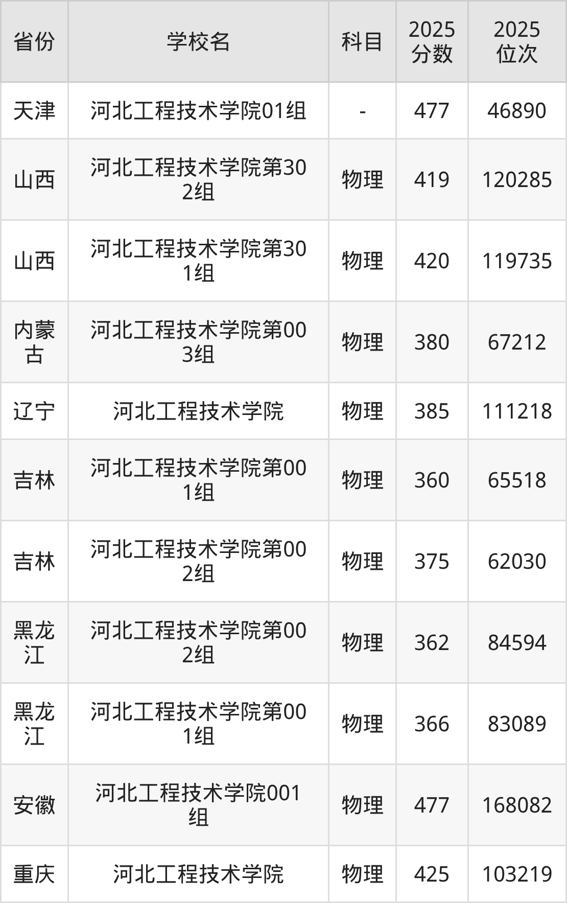 | 河北工程技术学 院 | 物理 | 459 | 224230 |