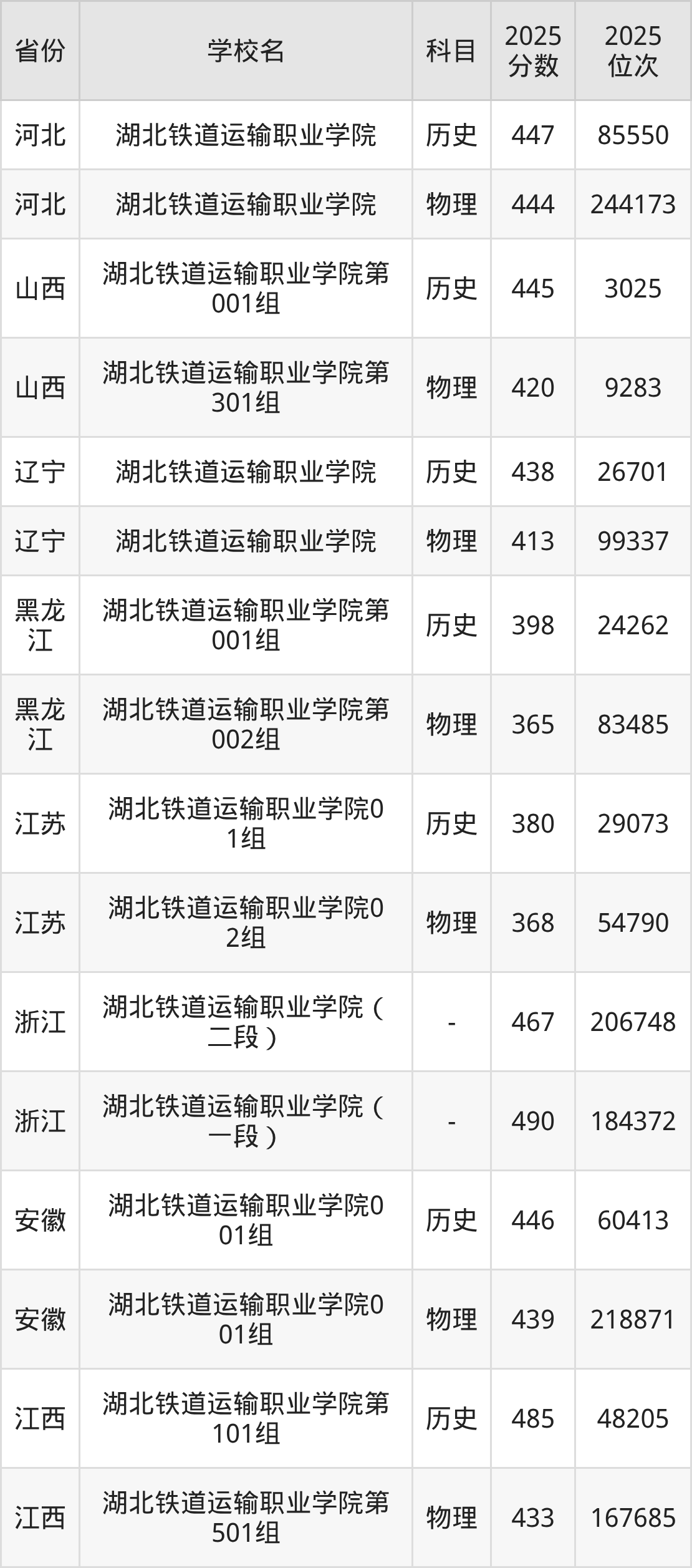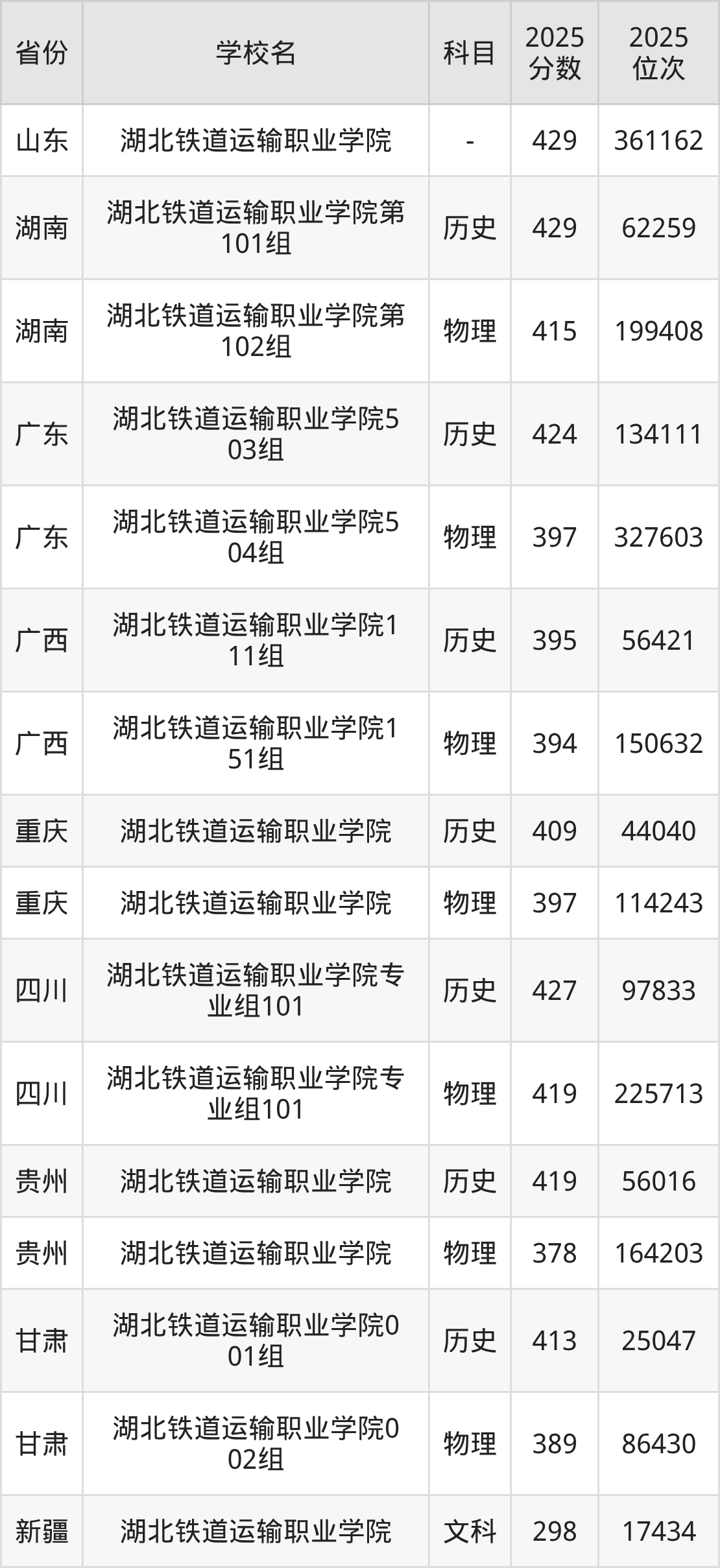 下面是湖北铁道运输职业学院2025年录取分数线各省汇总,一起来了解下吧。