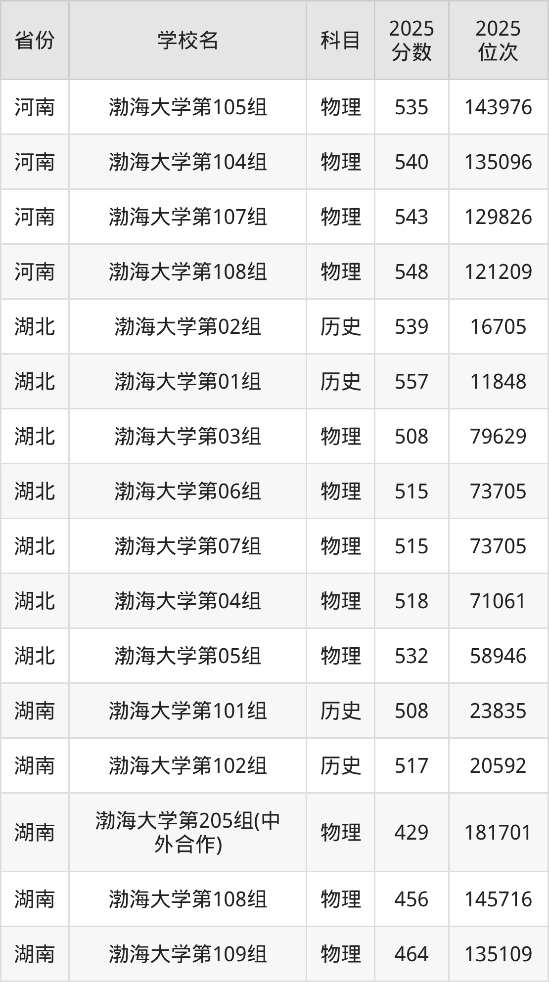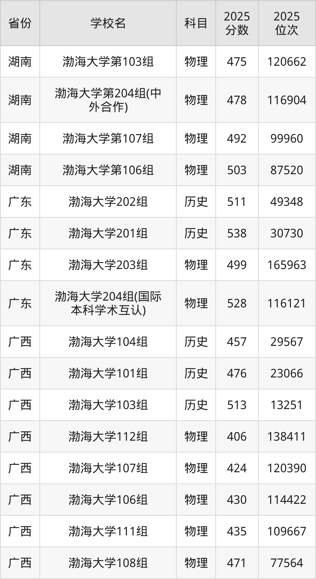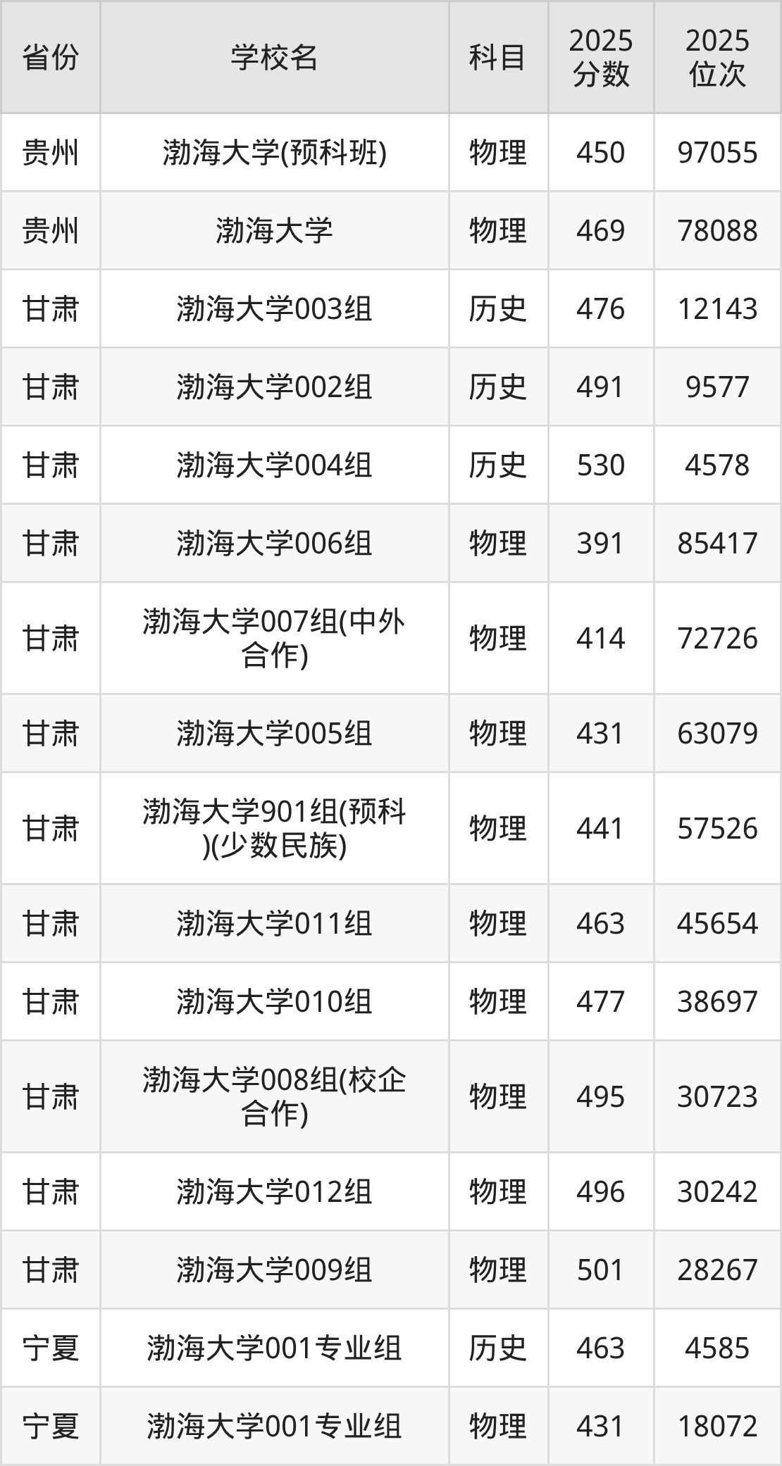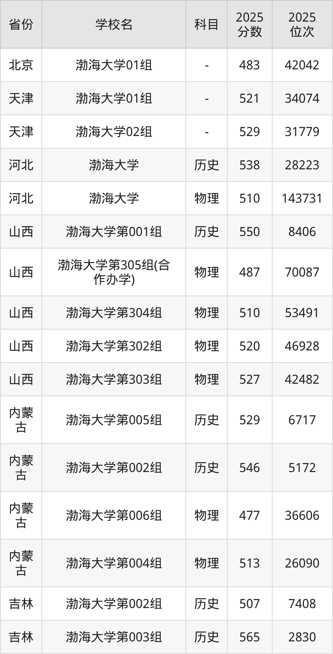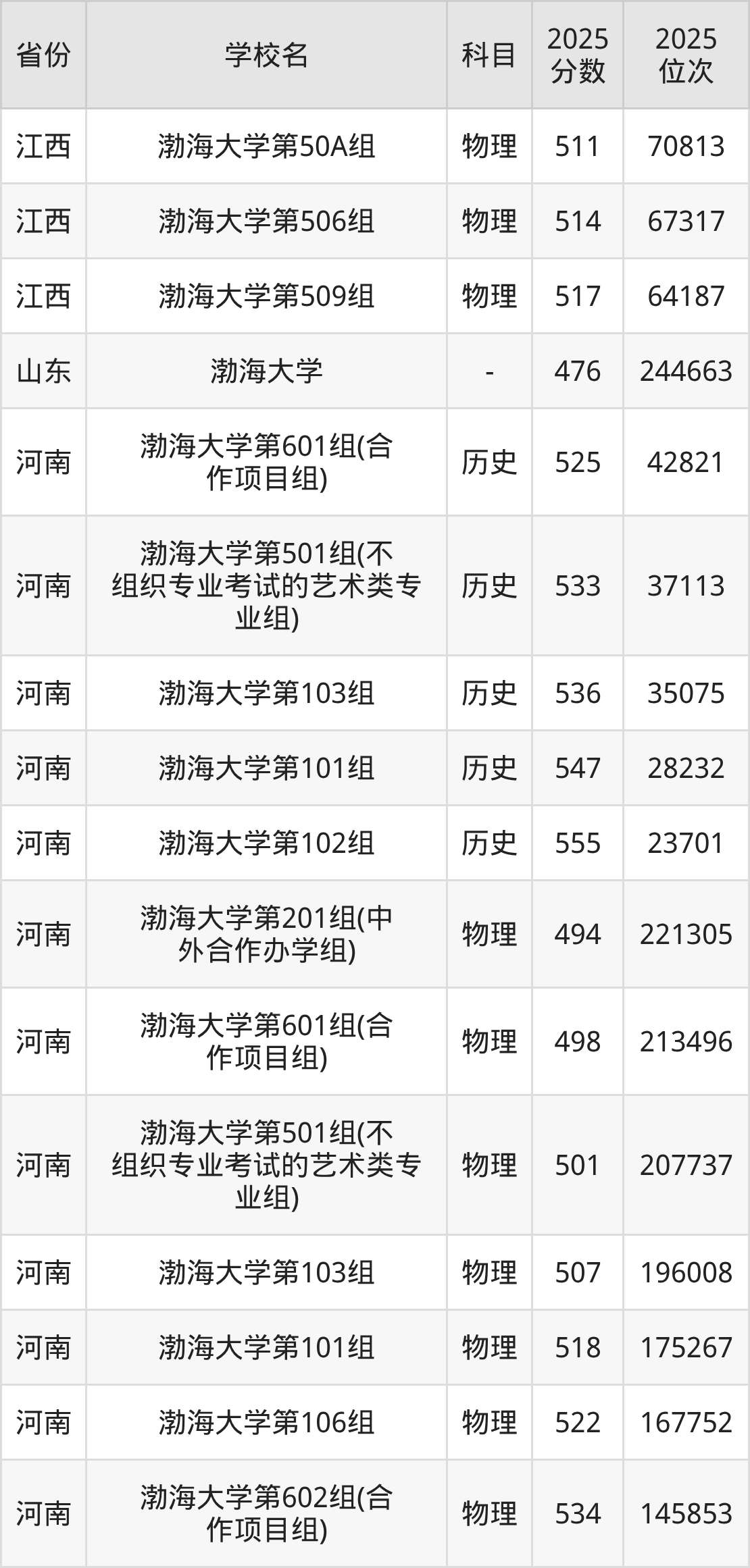 2025年渤海大学历史类最低分476分(19290名)、物理类最低分456分(78788名)。